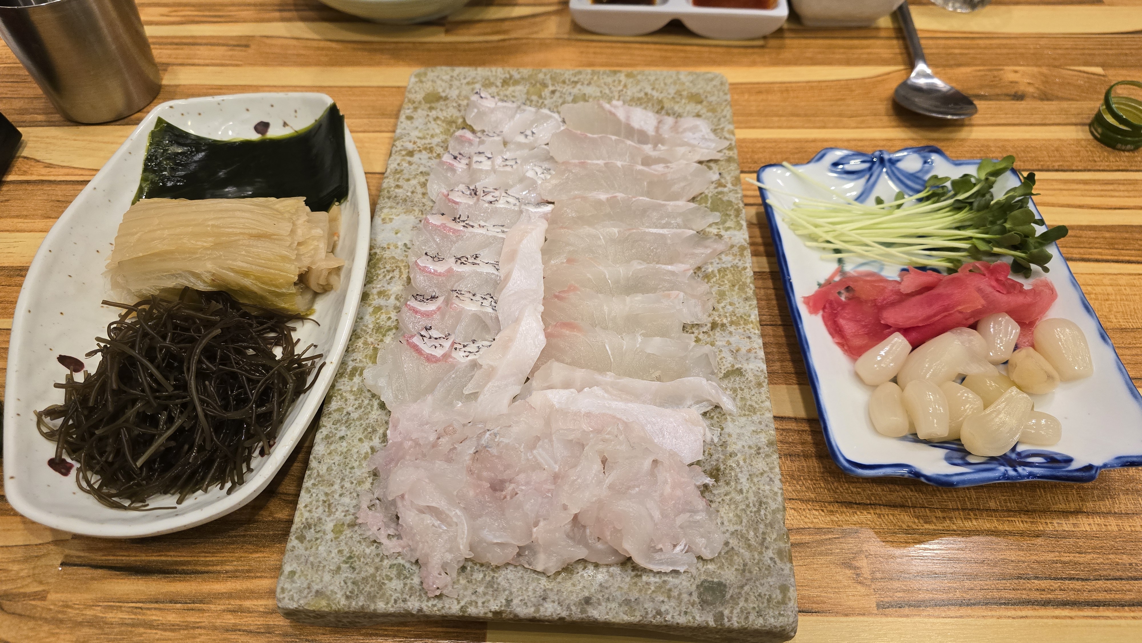맛있어보이는 자연산 회를 그냥도 먹어보고 간장도 찍어보고 백김치와 조합도해보고 해초와도 어울리며 여러가지 조합을 즐겨봅니다. 역시 자연산이라그런지 지방끼가 풍부한 맛과 향이 일품이며 입안에서 사르르륵 녹는 듯한 식감을 전해주고 있습니다. 특히 껍질을 살린 도미는 탱탱한 살과 껍질밑 지방의 맛이 더욱 활성화가 되어 무척 먹기가 좋은 식감과 맛을 전해주고 있습니다.