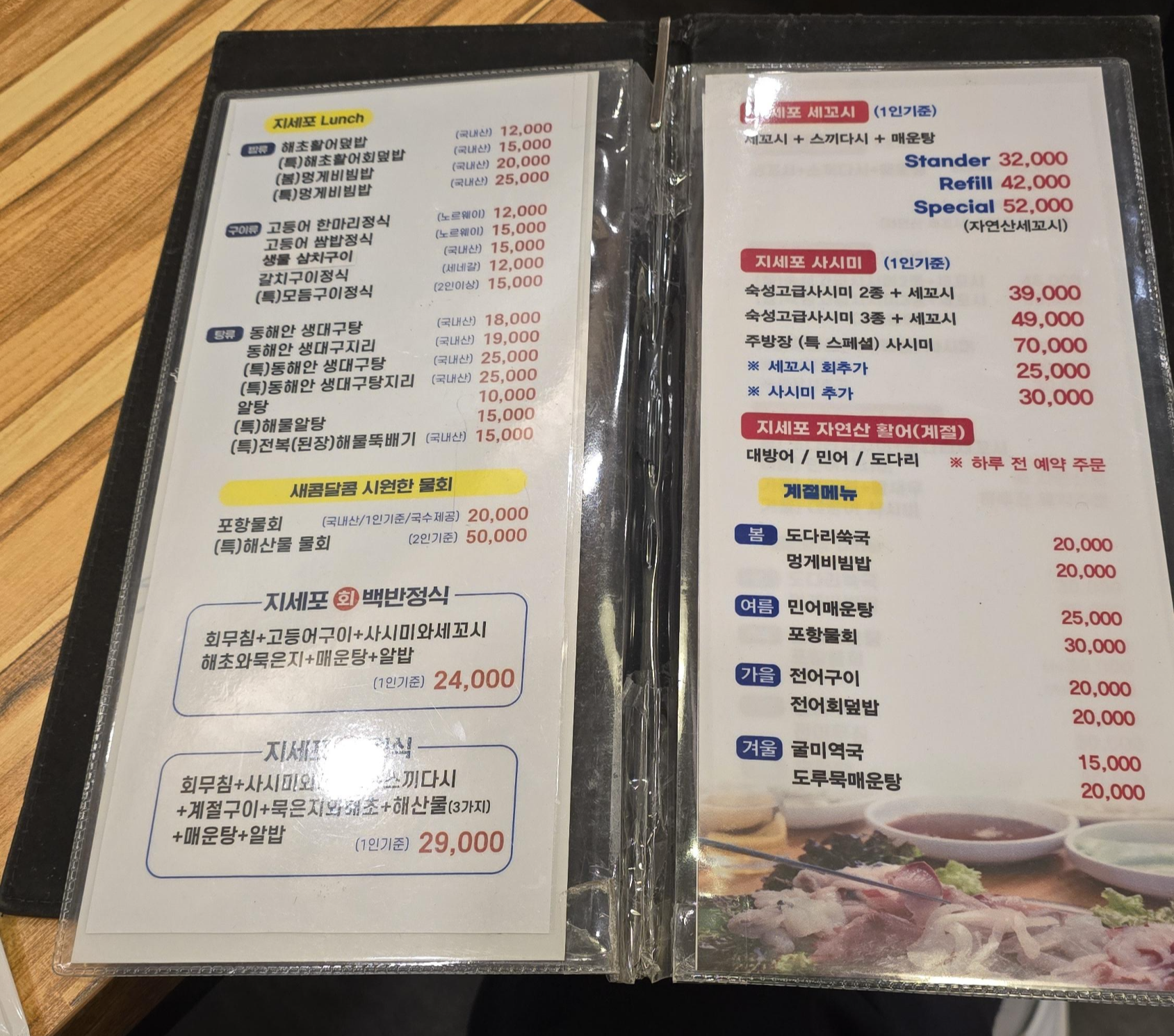 들어가서 자리를 잡고 메뉴판을 살펴보니 왼쪽은 저녁시간에 준비가 안되고 오른쪽에서 고르라고 하십니다. 그래서 자연산회를 먹는김에 스페셜을 주문하니 재료가 준비되지 않았다고 다른 것을 안내해 주십니다. 그래서 주방장 특 사시미를 골랐더니 역시나 안되고 숙성고급사시미 3종을 주문하니 그것도 준비가 안된다고 지세포사시미 2종+세꼬시를 안내해주십니다. 실상 가능한 메뉴는 1개밖에 없는데 뭘 오른쪽에서 고르라고 한건지 이해가 되지 않습니다만 그래도 자연산회라고 평소 알던곳이니 한번은 먹어보자는 마음으로 주문을 해봅니다.