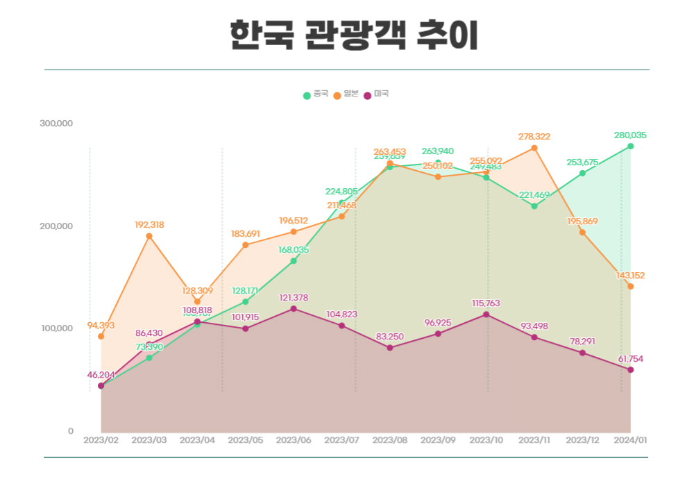 마지막으로 지난 1년간 한국을 방문 하는 관광객을 TOP3 국가에 대해 월별 추이를 살펴보면 일본인 관광객은 2023년 11월까지 상승곡선을 그리다 최근 급격히 하락하고 있는 모습을 살펴볼 수 있으며 이에 반해 중국인 관광객은 월별로 꾸준히 증가추세에 있는 것을 볼 수 있습니다. 3위인 미국은 횡보의 모습을 보이고 있어 앞으로 한국을 가장 많이 방문하는 외국인은 어떠한 나라가 될지 월별 변동폭이 커서 예측하기 어려우며 각 국가별로 어떠한 마케팅 전략으로 관광객들의 마음을 사로잡을지 관심있게 지켜보도록 하겠습니다.