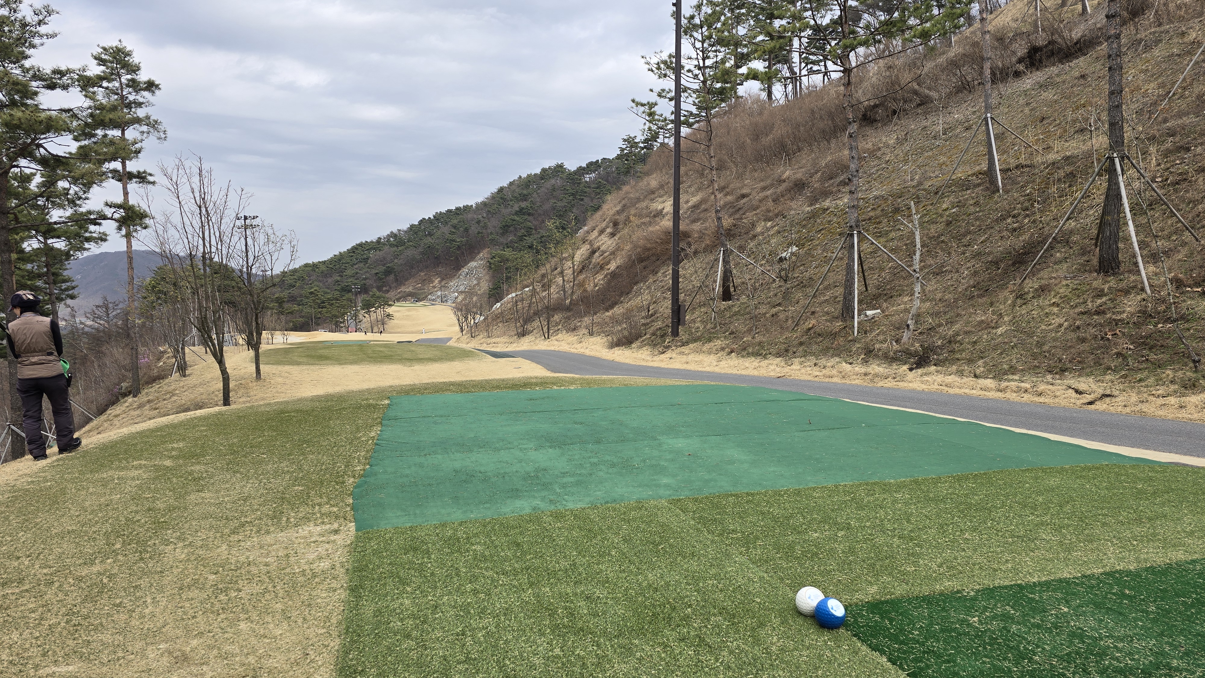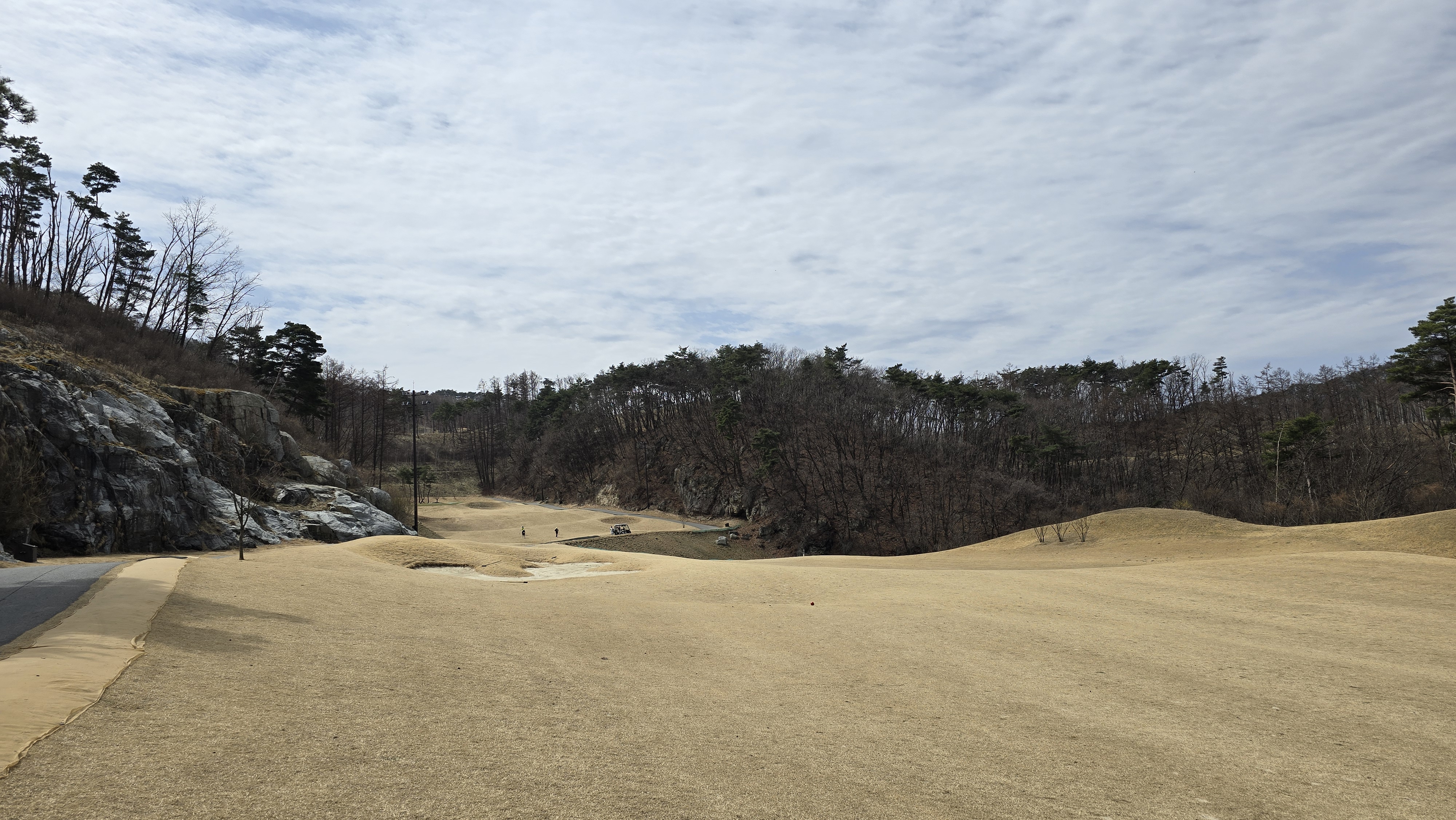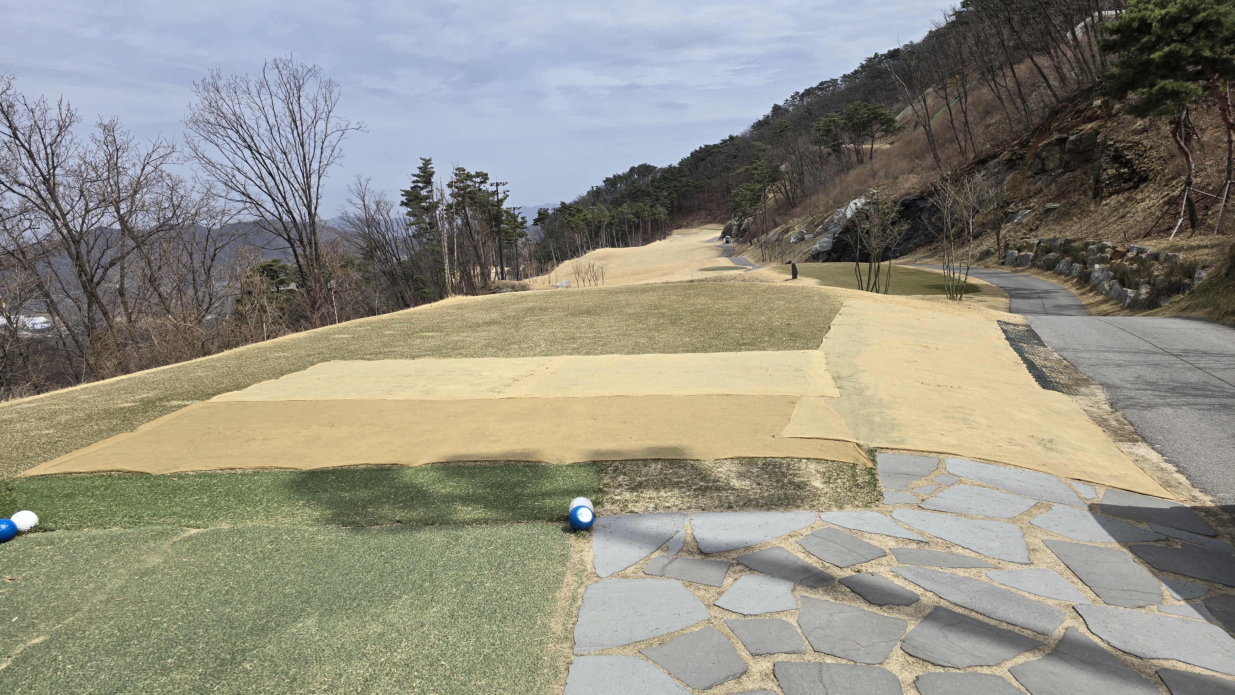 후반 파크코스 1번홀 477m 거리의 파5로 역시나 무척 좁은 코스의 상태를 보여주고 있습니다. 파크코스는 조금 다를까 상태를 보니 역시나 티샷지역 잔디 다 죽어서 씨 뿌리고 천으로 덮어놓고 페어웨이 잔디도 초록색 하나 없는게 다 죽어서 긁고 씨 뿌리고 모래 뿌리고 물줘서 잘못걸리면 뻘밭이고 파크 코스는 다르지 않을까 잠시나마 희망을 가졌던 것이 절망으로 편하게 됩니다. 코스 공략 쓸 마음도 없어지는 많은 골프 후기 중 처음으로 겪는 기분을 경험하게 됩니다.