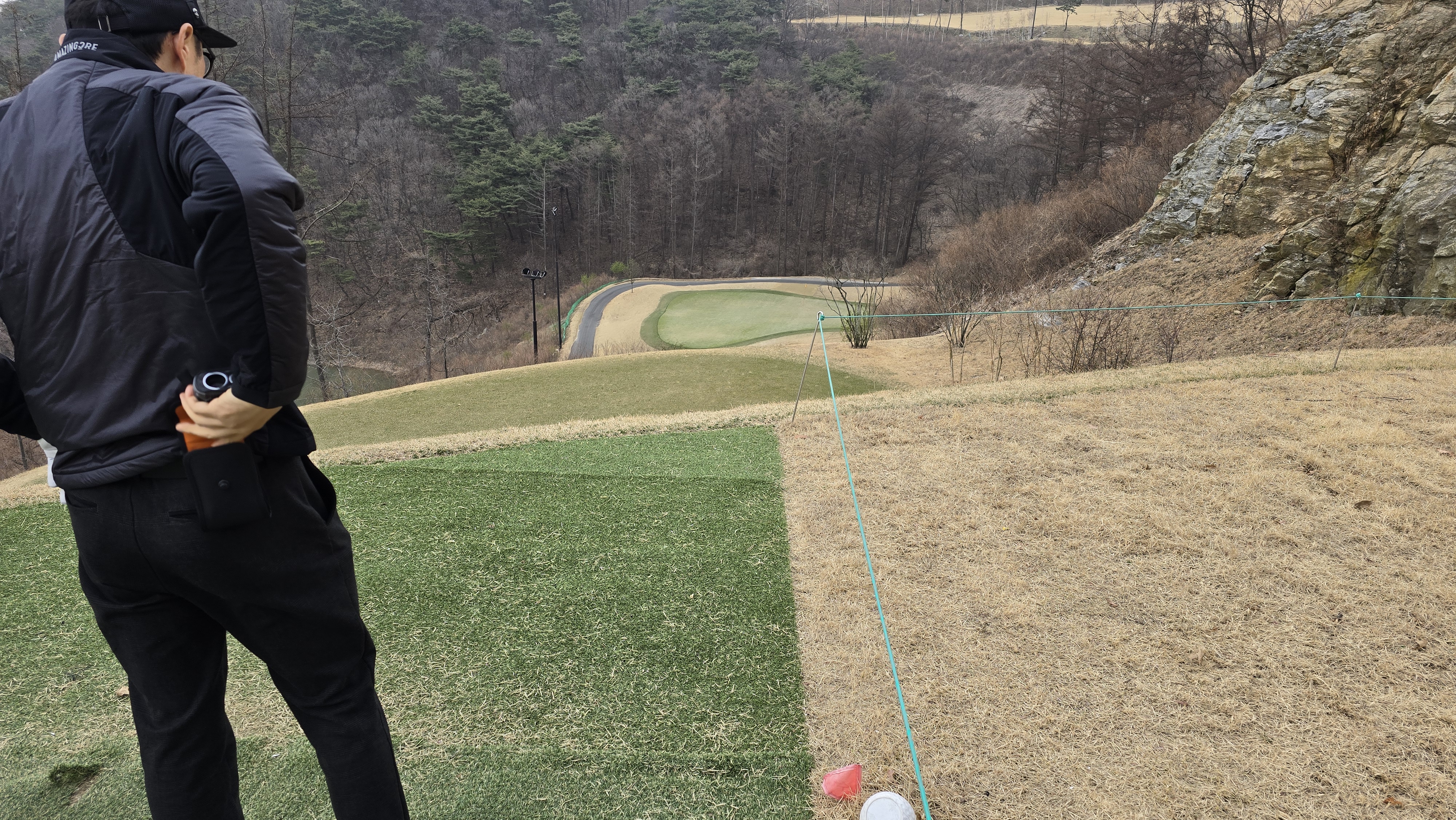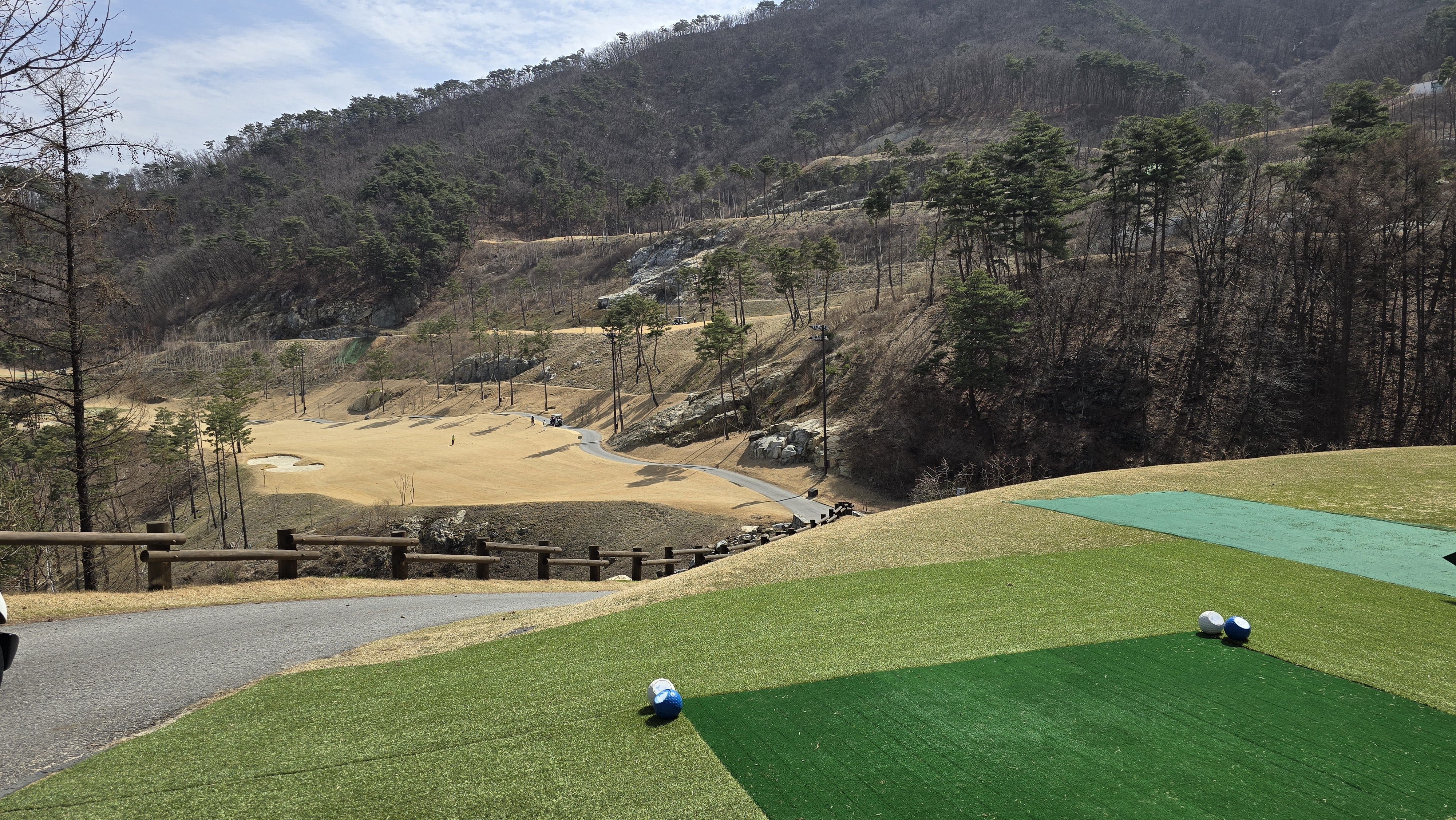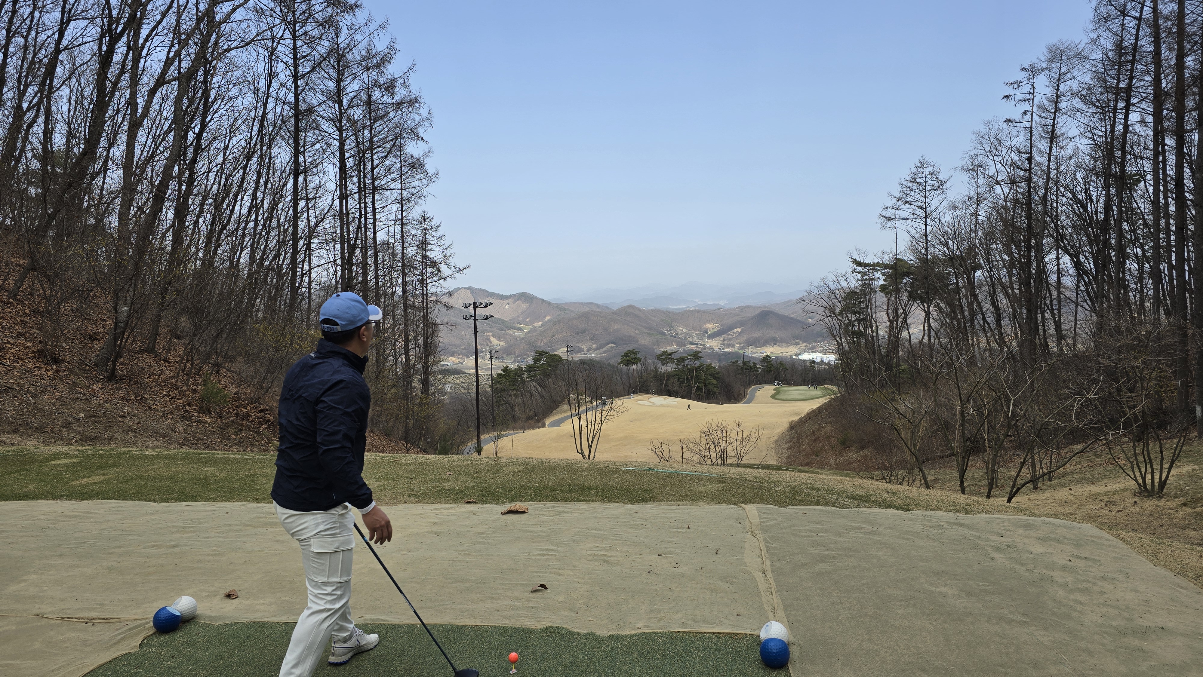드디어 라운딩 시작 마운틴 코스 1번홀 부터 시작합니다. 시작부터 심리적 압박감을 느끼도록 계곡을 넘겨 좁은 페어웨이에 티샷을 안착시켜야하는 코스입니다. 우측은 절벽법면이라 약간 열려도 어느정도 가능성이 있지만 왼쪽은 깎아 내려가는 내리막으로 당기면 전혀 가능성이 없는 코스이니 힘을 줘서 당기지 않도록 조절하는 것이 매우 중요합니다.