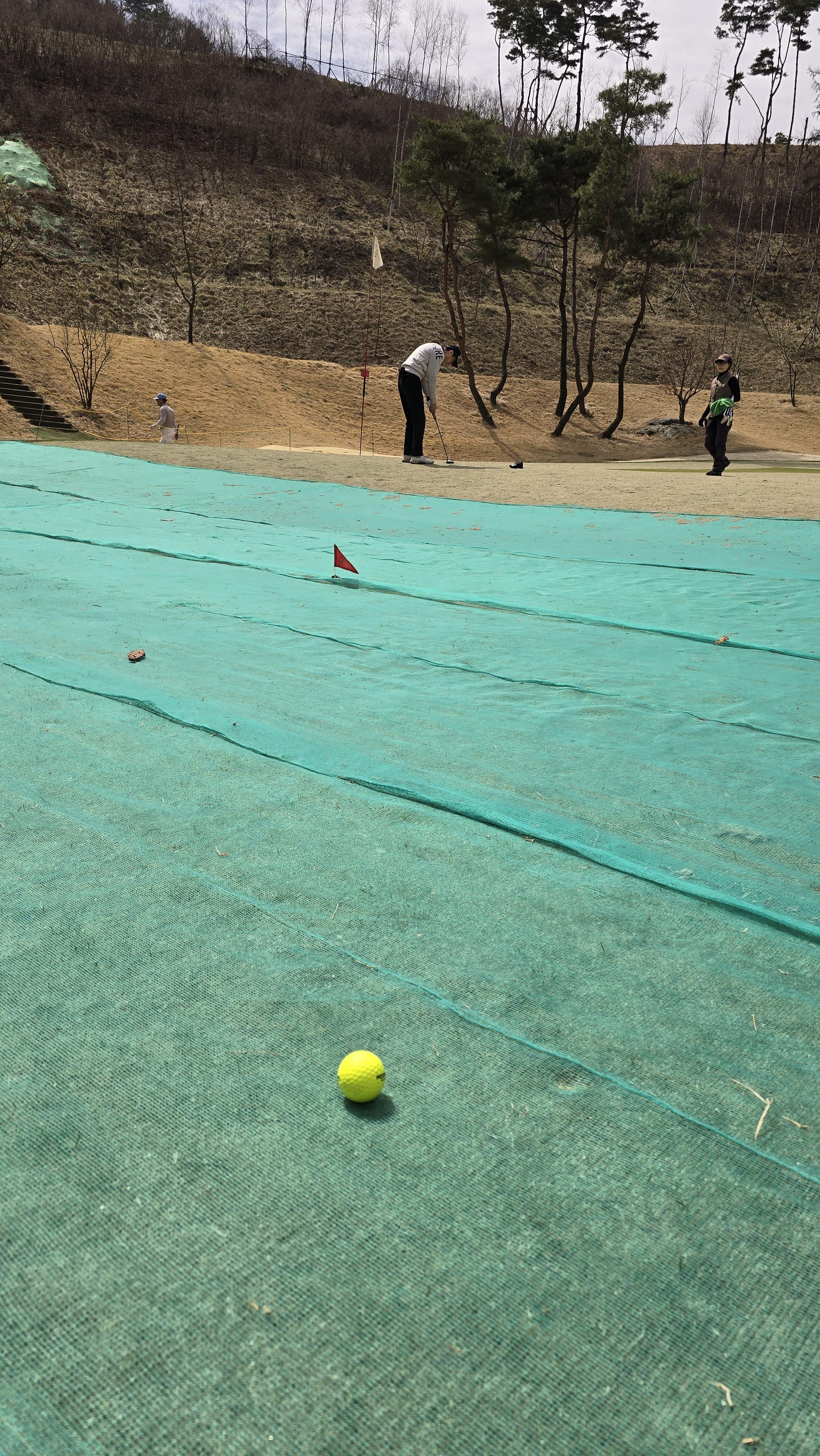 멋지게 그린에 온을하고 가서 상태를 살펴보니.... 그린에 절반이상이 잔디가 죽어서 수리지로 천을 덮어 놓은 모습입니다. 런이 없어서 붙지도 못해 아쉽고 이걸 드랍을 해서 쳐야하는데 애매하고 드랍을 해도 서로 눈치를 보게 되고 아주 총체적 난국에 부딪히게 됩니다. 아니 이 정도면 예약을 받지 말아야하는 것이 아닌가 손님을 얼마나 등쳐먹을 호구로만 생각하면 이렇게 골프장을 관리하고 돈은 다받는단 말인가 캐디님께 억울한 마음에 여쭤보니 전부 욕을 하고 간다고 어쩔 줄을 몰라 하십니다. 하아....