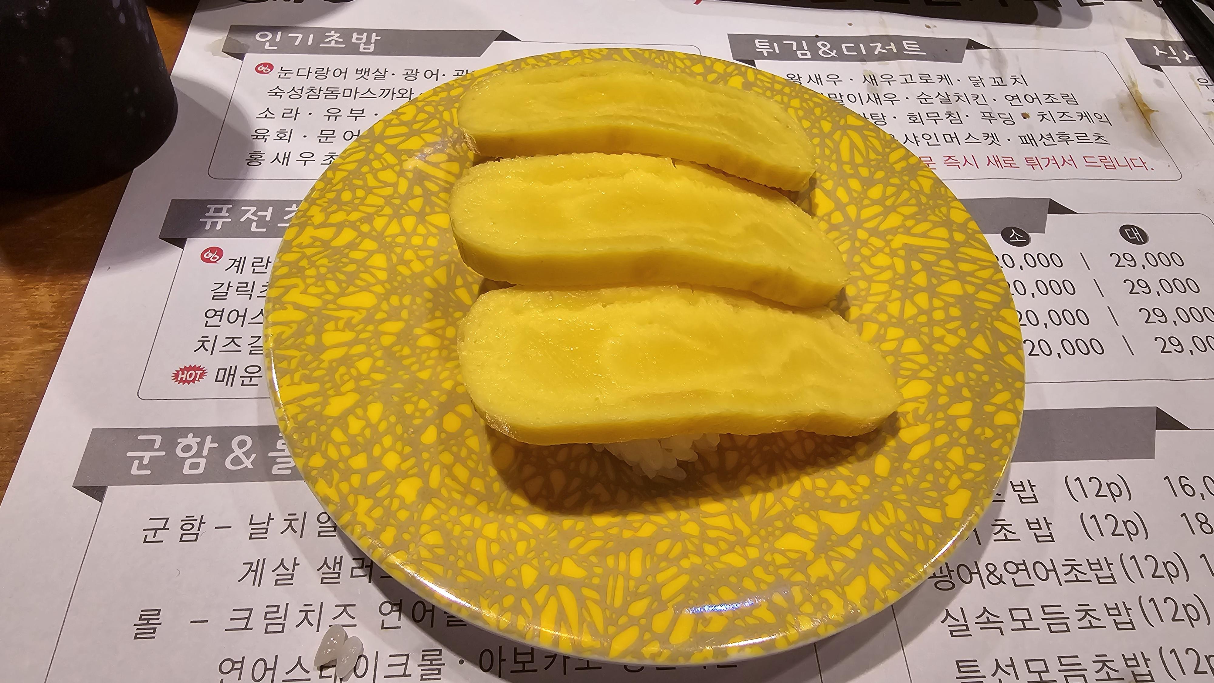계란초밥을 마무리로 하려 했는데 거대한 장어가 시선을 사로잡고 있습니다. 일반적인 우나기초밥이 아닌 밑에는 계란을 깔고 초밥은 맛살이 들어간 캘리포니아 롤스타일의 퓨전 초밥으로 비주얼만 봐도 맛이 어떨까 호기심을 가지게 만드는 스타일로 고르고 맛을보니 장어가 너무 퍼져버려서 탄력이 없습니다. 2600원 접시에 2피스나 담겨있어서 큰 기대를 한 것은 아니지만 마무리를 하기에는 아쉬운 작품이라고 생각케 됩니다.