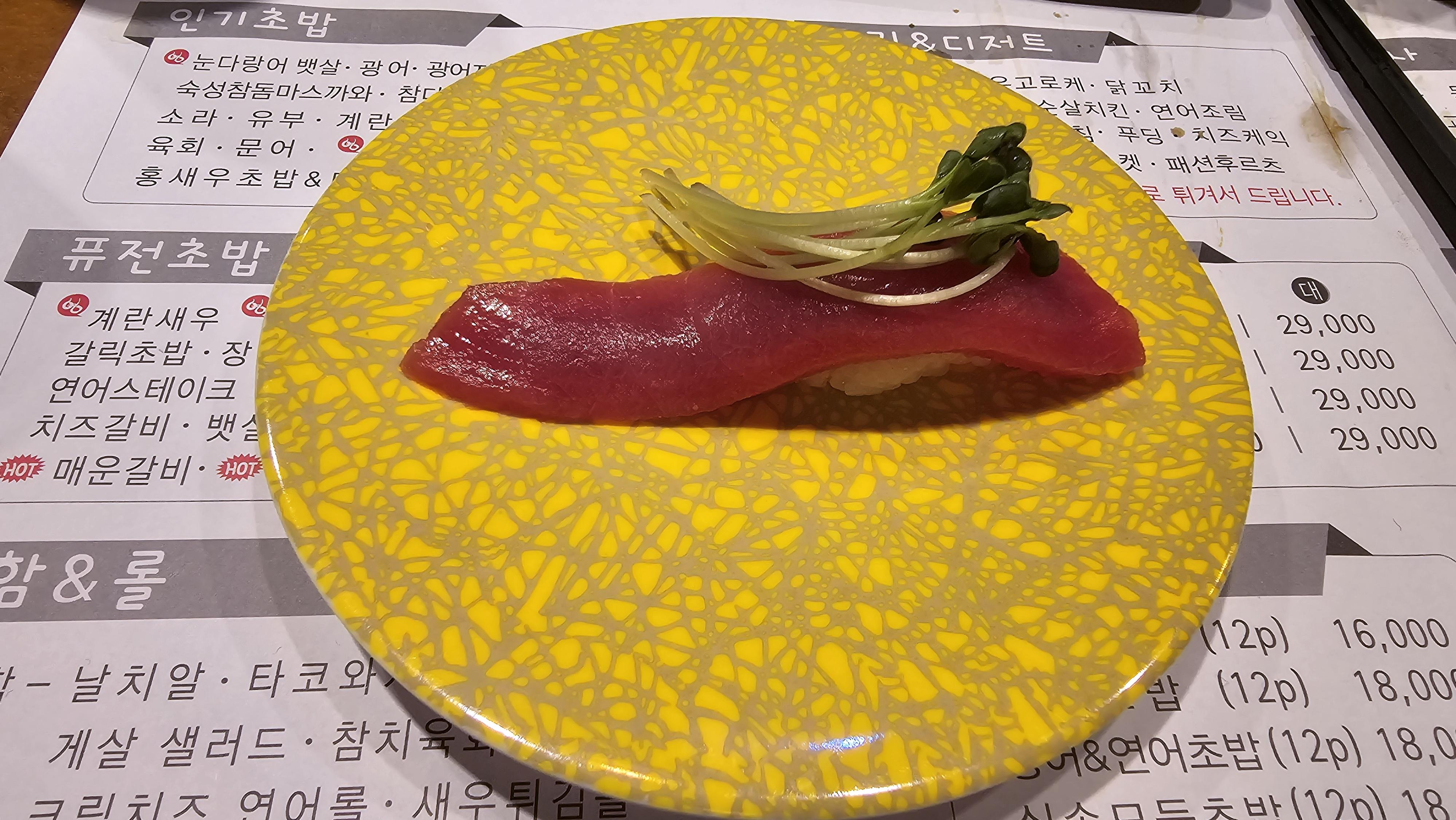 참치 붉은살 다음에는 참치의 뱃살이 먹어보고 싶어 찾아보니 눈다랑어 뱃살에 묵은지를 김으로 고정시키고 위쪽에 무순을 올려서 상당히 예술적으로 보이는 초밥을 발견하게 됩니다. 비주얼을 잠시 감상을 하고 한입에 모두 넣으니 풍부한 지방맛과 약간은 새콤달콤한 묵은지가 어우러져 환상의 조합을 나타내주지만 오래올려져 있는 걸 먹어서인지 약간의 질척거림과 김의 눅눅함이 걸리적 거리는 것을 느끼게 됩니다. 역시 회전초밥에서는 만들어진지 얼마 안된 걸 골라내는 안목이 있어야 합니다.