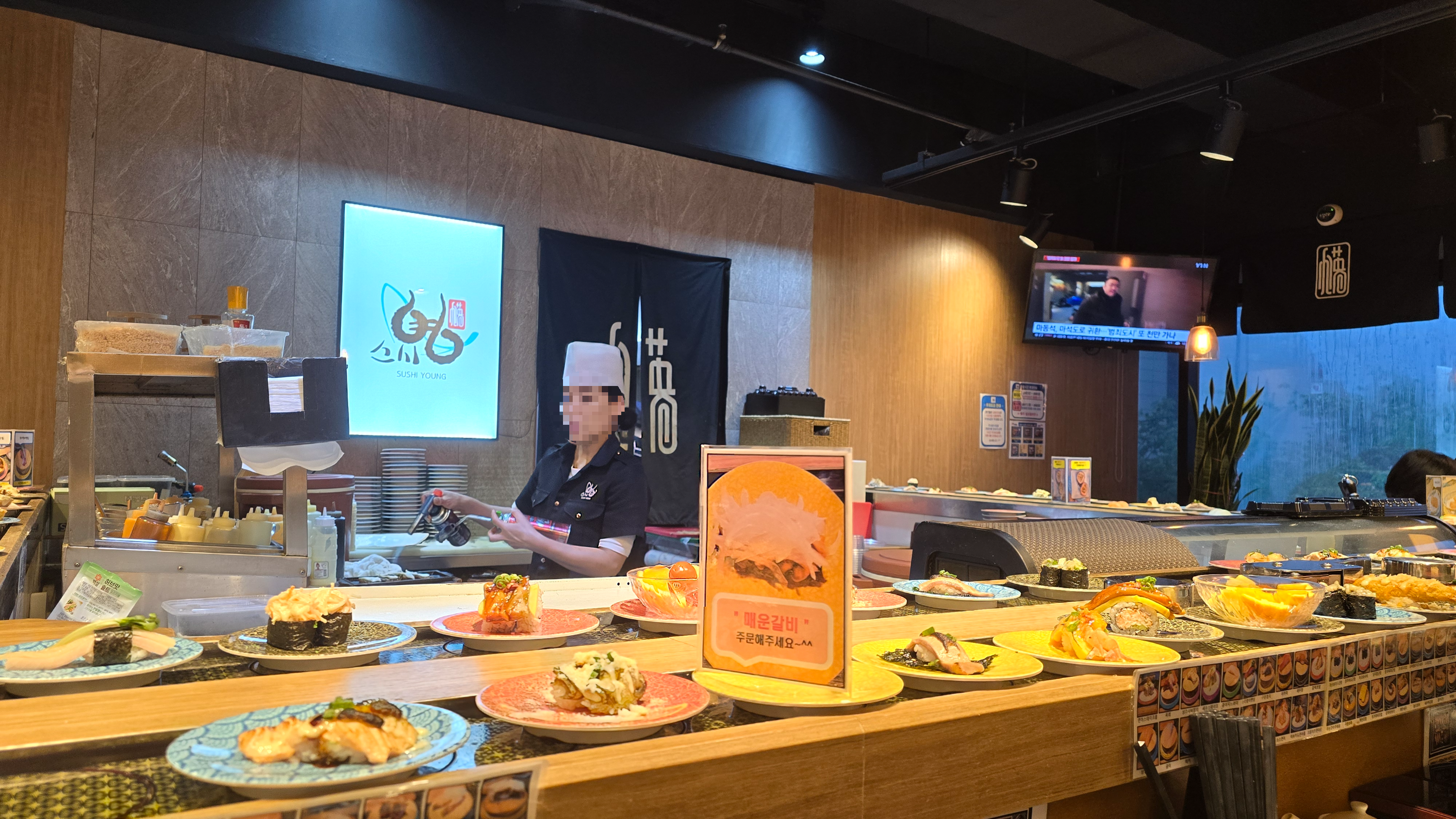 주방장님이 마주보이는 테이블에 자리를 잡고 앉아서 가게 분위기를 살펴보니 제법 넓어보이는 주방에 회전초밥레일도 길어서 여러가지 초밥이 릴레이로 연결되는게 참으로 정통회전초밥집의 분위기를 물씬 풍기도 있습니다.