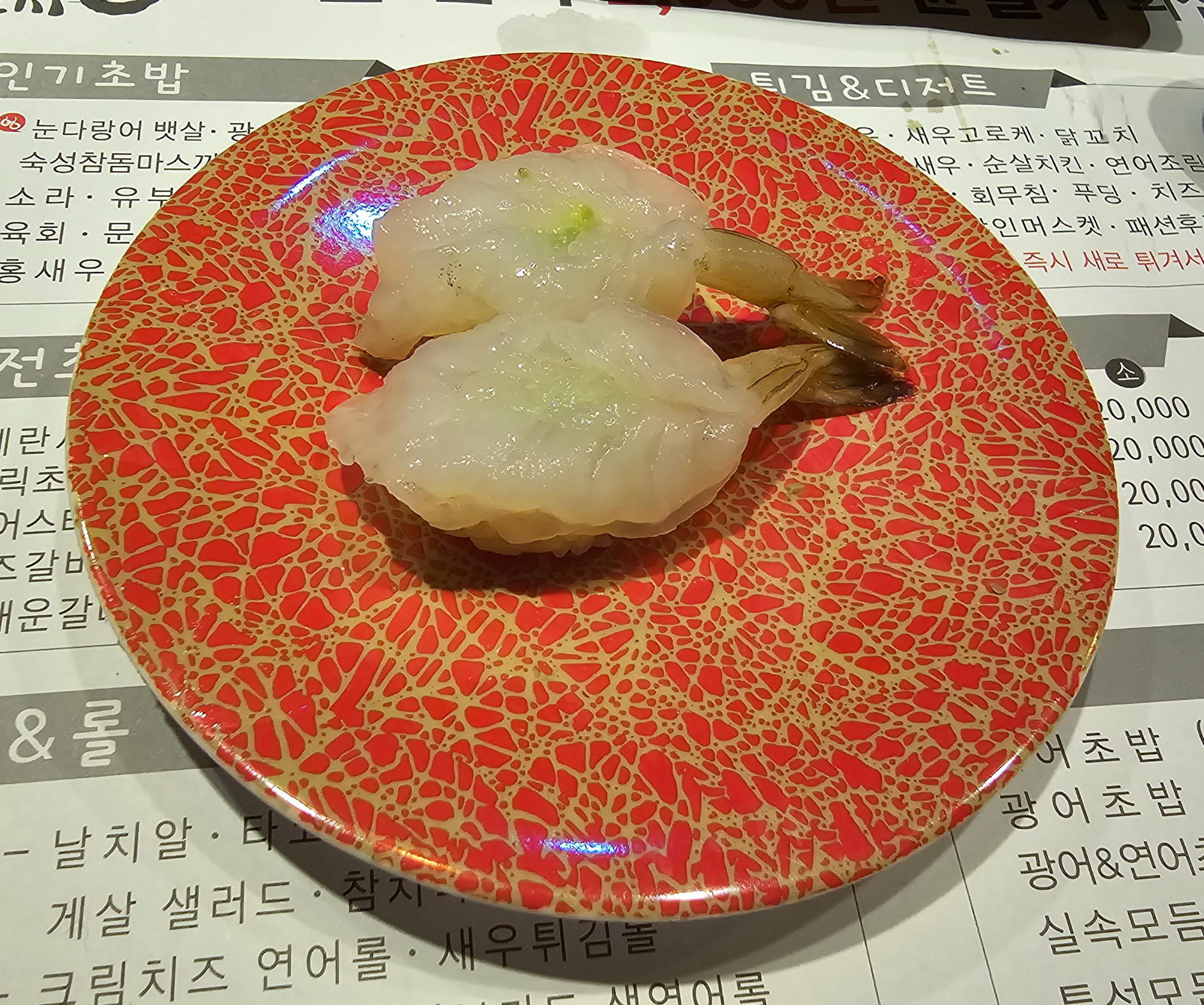 초새우의 충격에서 벗어나기위해 다시 생선으로 돌아가서 연어와 묵은지 광어를 선택하고 맛을 보니 정통 연어 초밥과 양파 그리고 소스의 조합이 무척좋으며 묵은지광어는 역시 실패가 없는 조합임을 깨닫고 천천히 음미하며 재료본연의 맛들을 느껴봅니다.