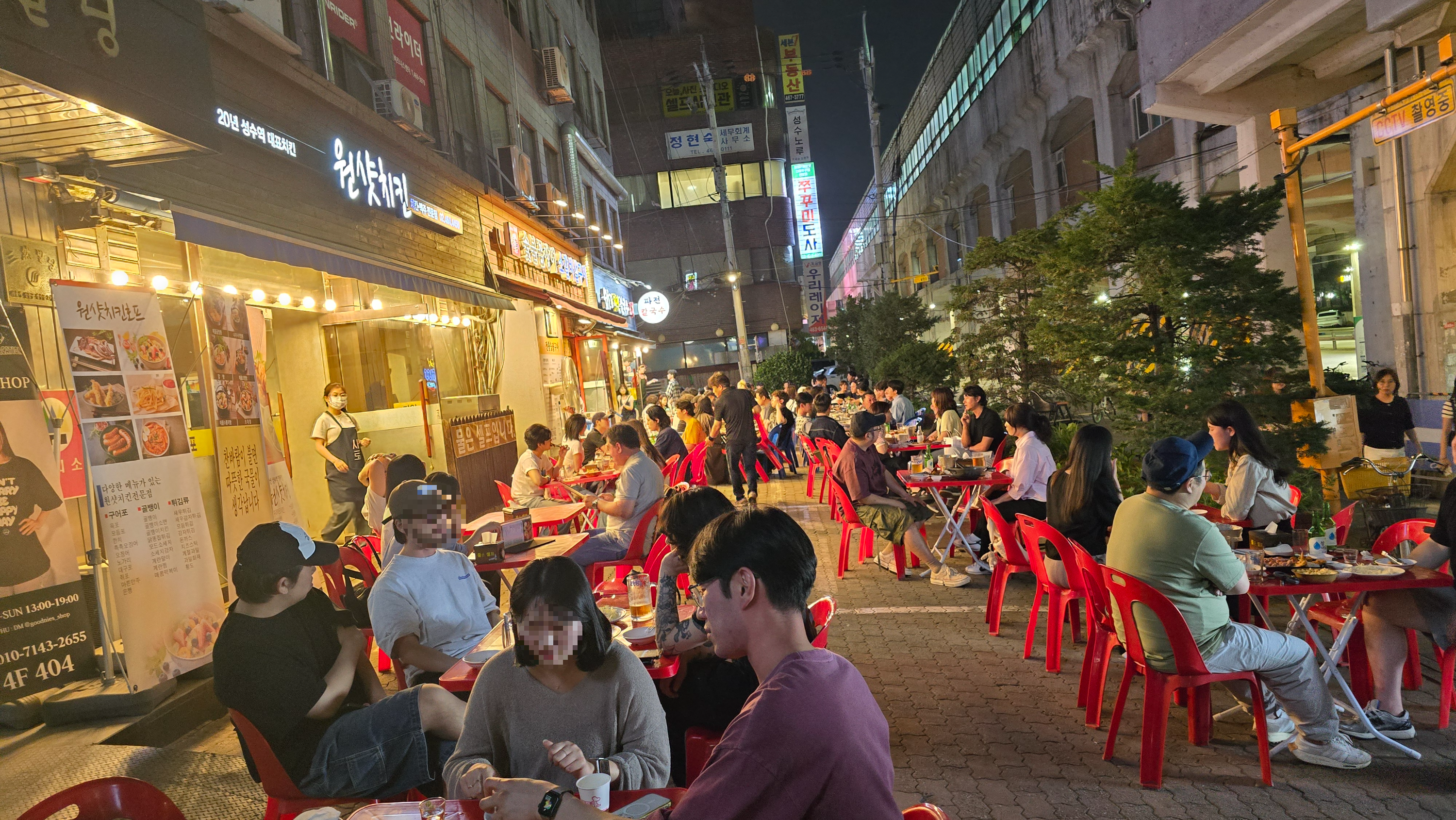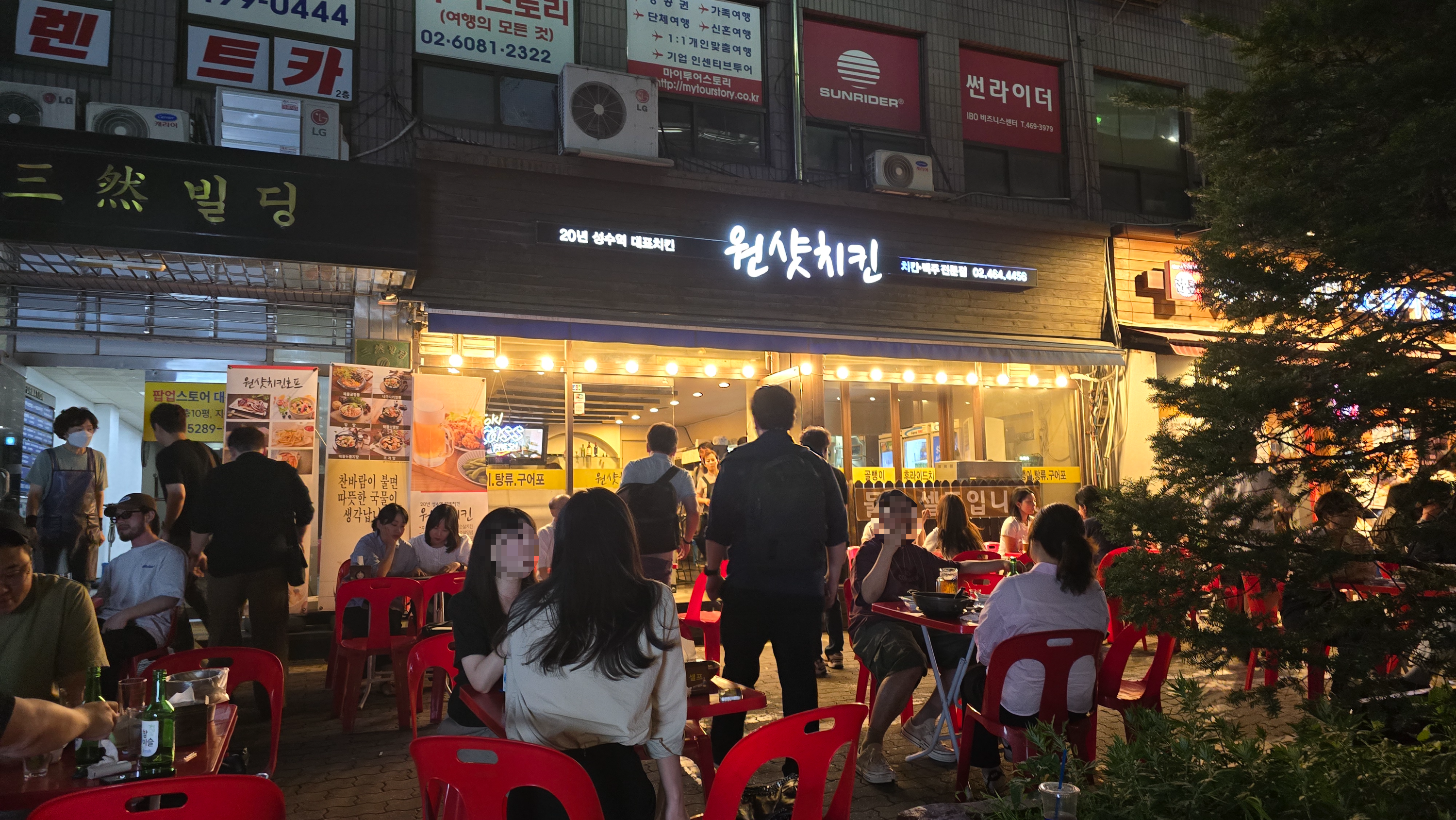 예전 공업단지의 이미지에서 벗어나 젊음의 거리로 재탄생하고 외국인들도 많이 방문하는 관광명소로 이미지 변신중인 성수동에서 한잔 하기로 하고 날씨도 좋은데 야장분위기를 가장 잘 낼수 있는 곳이 어디인지 한바퀴 둘러보다 성수역 바로앞에 자리잡은 원샷치킨이 매우 분위기가 좋아보여 바깥에서 시원한 밤바람을 맞으며 한잔해보기로 합니다. 늦은 저녁인데도 이미 사람들이 발디딜틈없이 많이 모여들어 저마다 야장분위기를 즐기고 있는 모습이 보입니다.