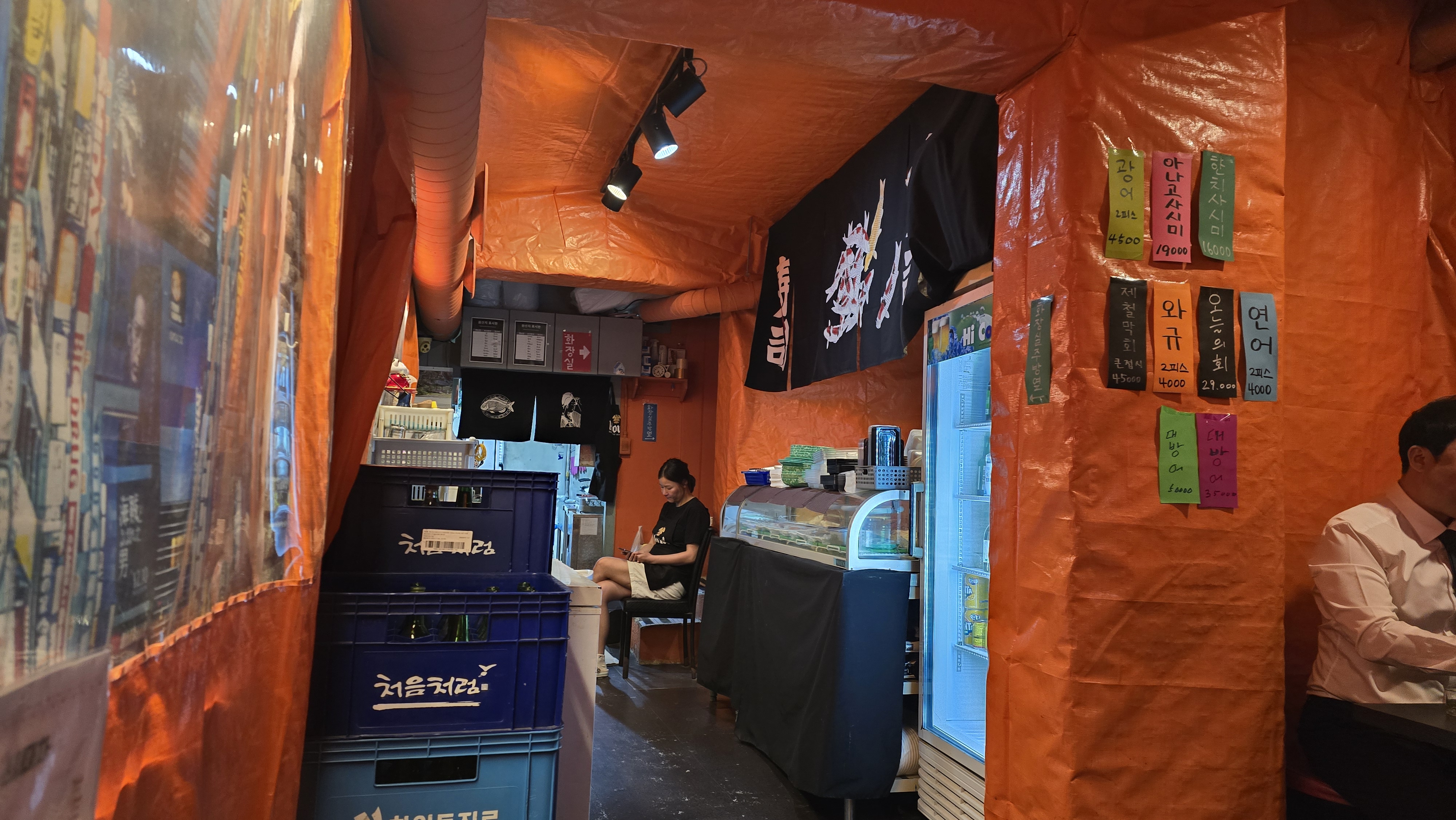 가게안으로 들어가니 특이하게 포장마차 스타일로 내부 인테리어를 꾸며놓은 것이 이색적으로 보입니다. 주황색 천막을 연상케하는 분위기게 다양한 메뉴판이 붙어있고 가게도 약간은 좁고 북적이는 스타일로 취향저격스러운 모습을 보여주고 있습니다.