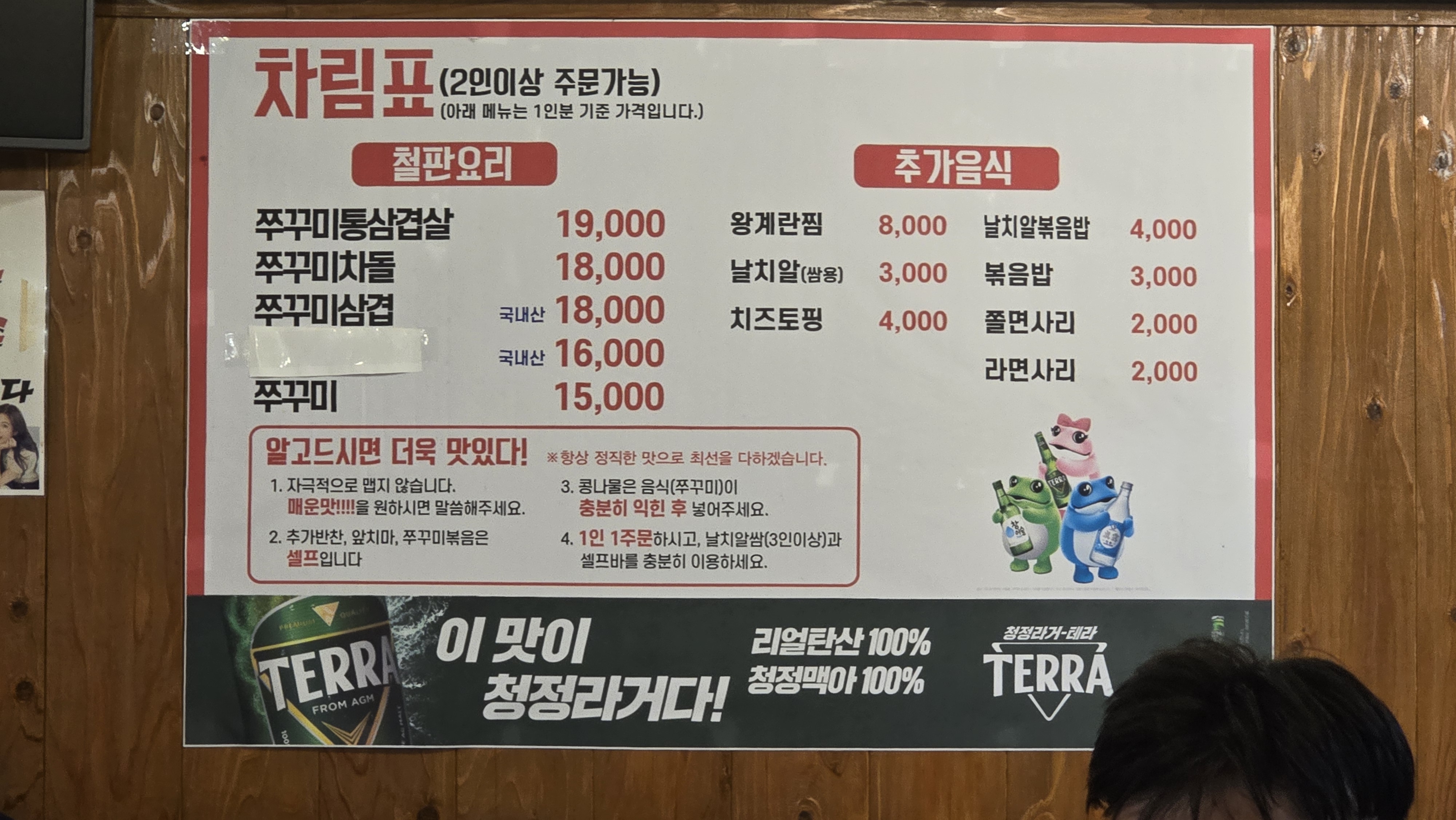 들어가서 자리를 잡고 메뉴를 살펴보니 쭈꾸미철판 고정메뉴에 삽겹살을 올릴지 차돌을 올릴지 선택을 할 수 있는 구성임을 보게 됩니다. 무엇으로 쭈꾸미와 조합을 할지 혹은 쭈꾸미 단독으로 먹을지 고민을 하다 쭈꾸미와 삽겹살의 조합이 서로를 보완하는 좋은 작용을 할 것 같아 쭈꾸미 삼겹을 주문하고 기다려봅니다.