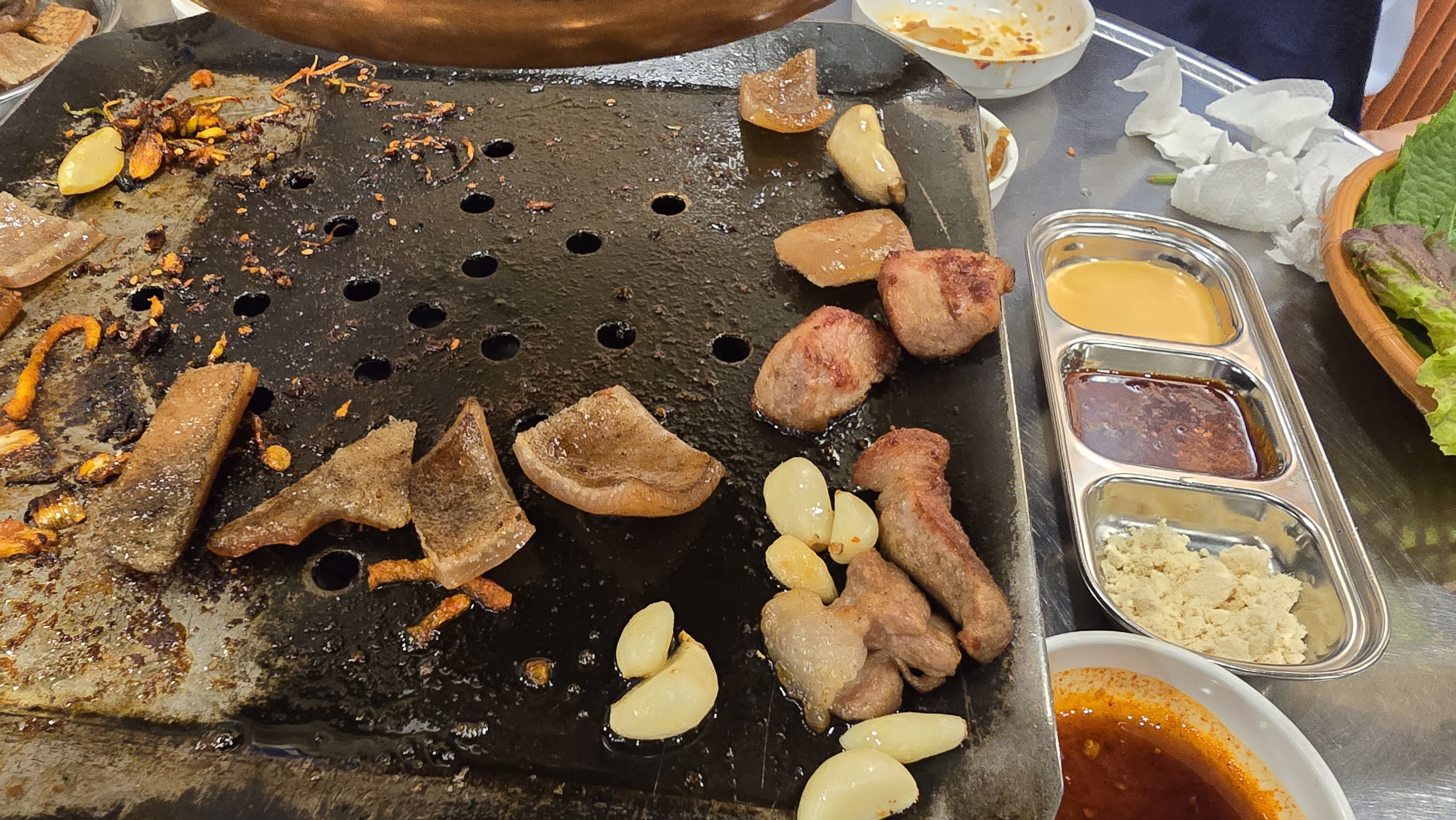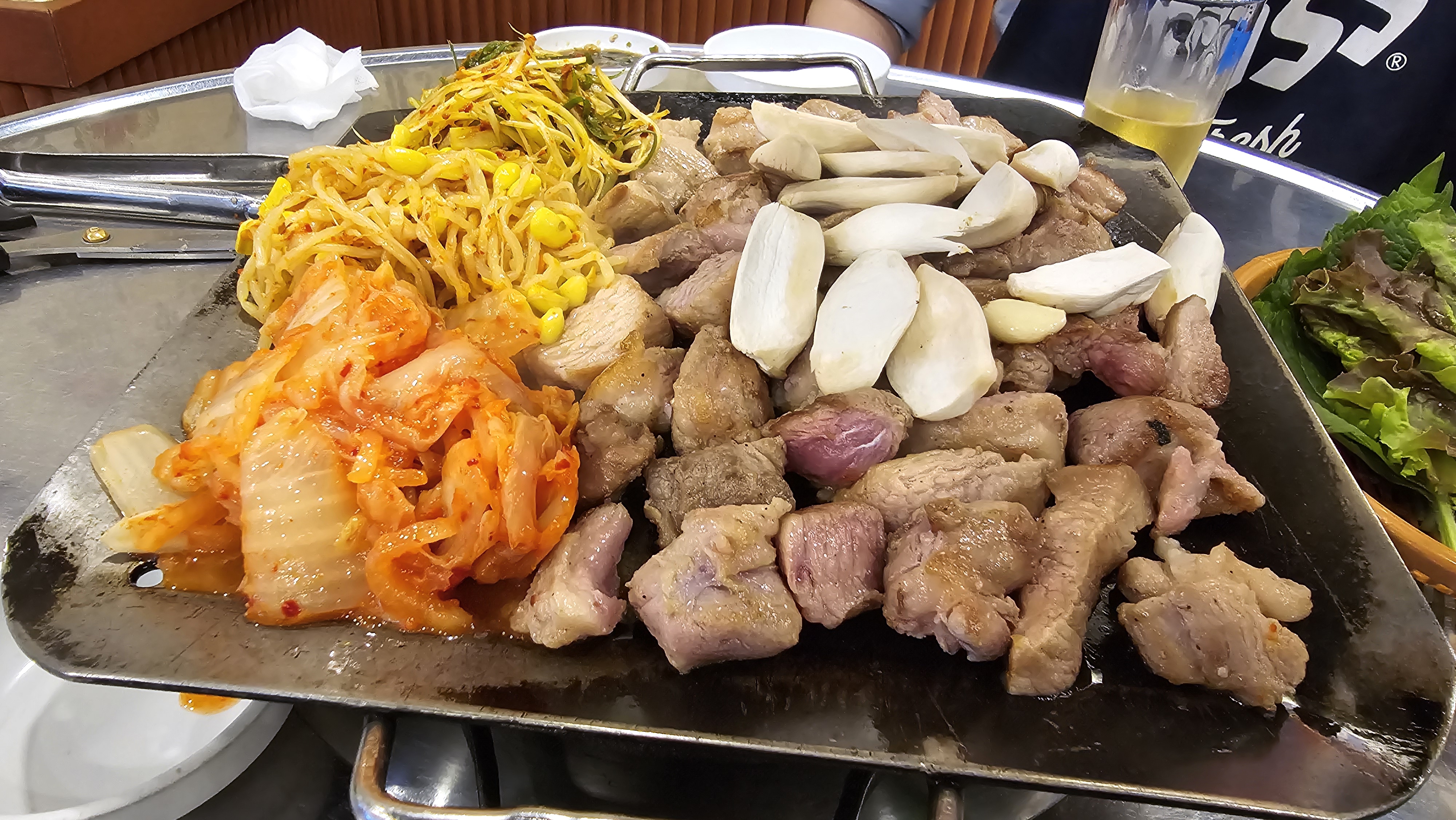 고기가 어느정도 구워지자 철판위에 김치와 콩나물 그리고 버섯과 마늘까지 듬뿍 올리자 푸짐한 뒷고기 한상이 차려졌습니다. 생고기를 큼지막하게 썰어서 숯불에 구워내는 고급스러운 조리법으로 맛이 어떨까 벌써부터 기대가 되고 있습니다.