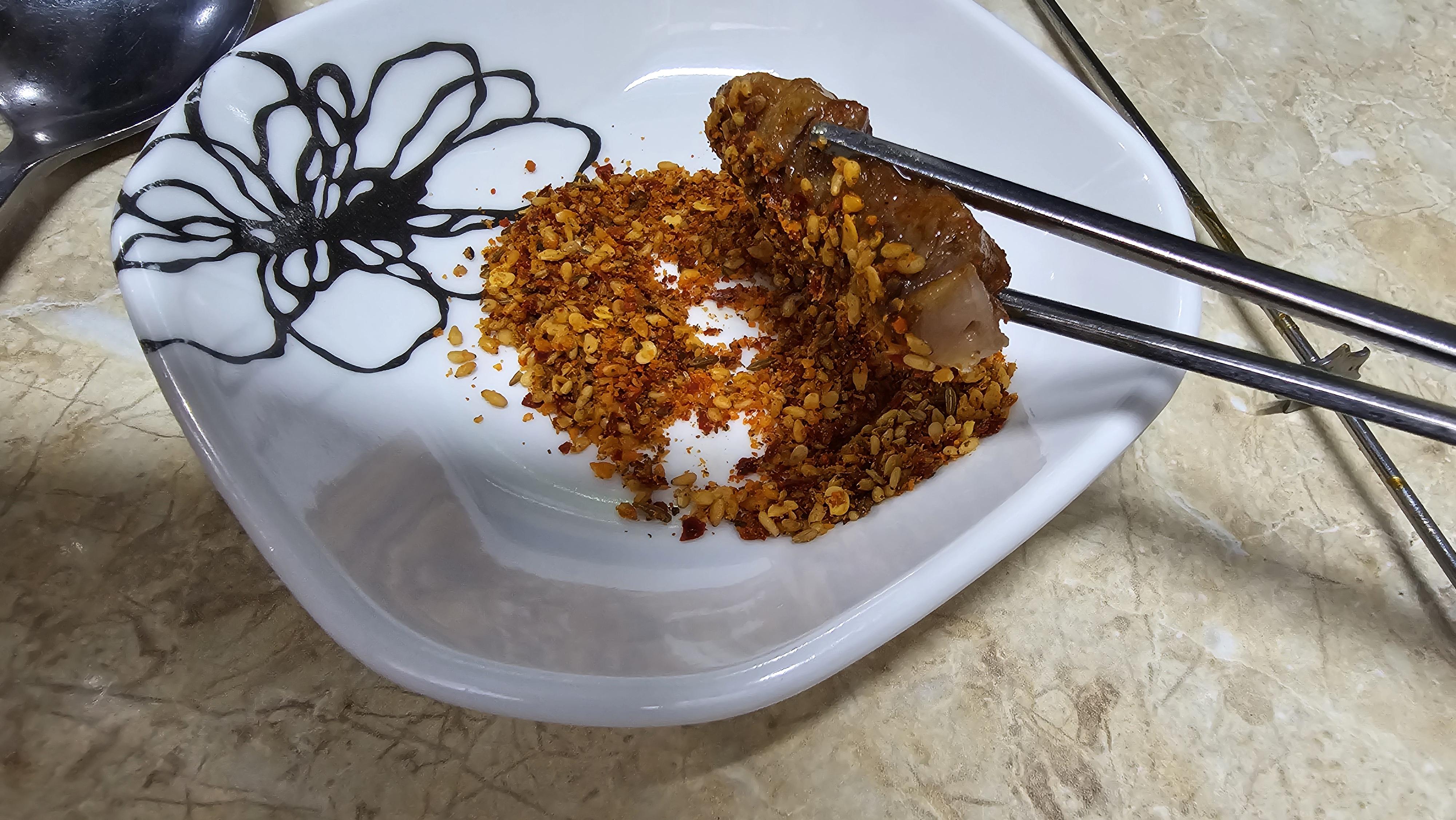 잘익은 양꼬치를 양꼬치소스에 듬뿍찍어서 맛을보니 상당히 강한 양념맛이 후욱 하고 들어옵니다. 자세히 살펴보니 양념에 기본적으로 고추씨도 들어가있고 다른 곳에 비하여 양꼬치 시즈닝의 맛과 향도 강한 편입니다. 그리고 양꼬치 자체의 양념도 상당히 강하기 때문에 전형적인 중국 노포스타일 양꼬치의 맛과 향을 보여준다고 생각되어 호불호가 갈릴수도 있겠다는 생각을 하게 됩니다.