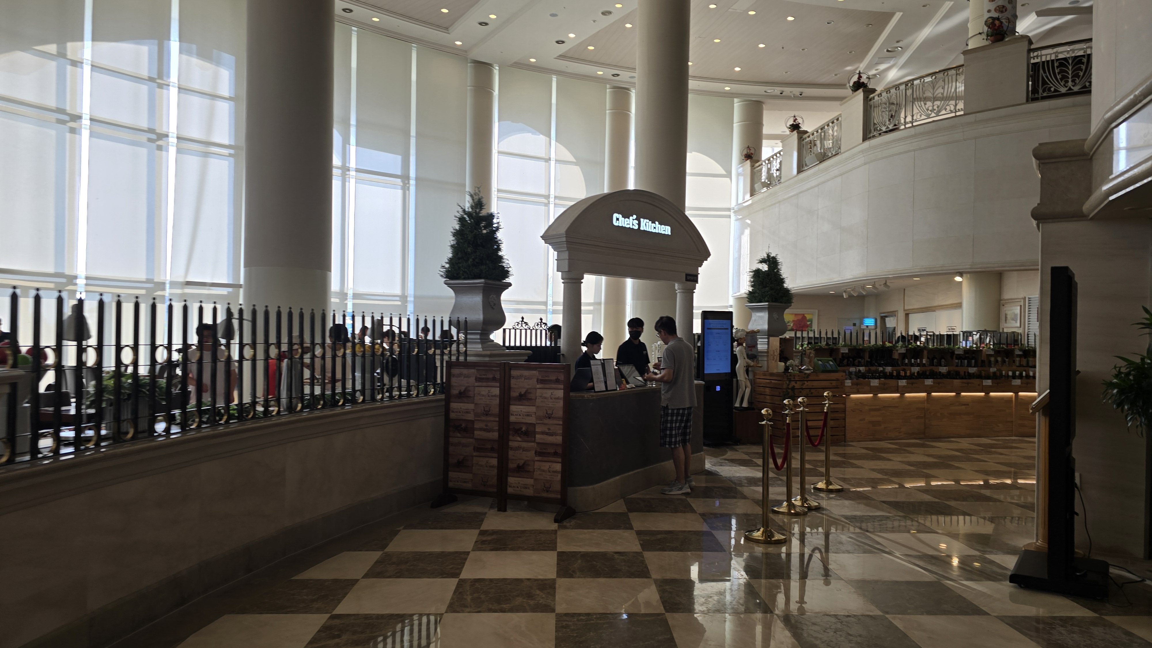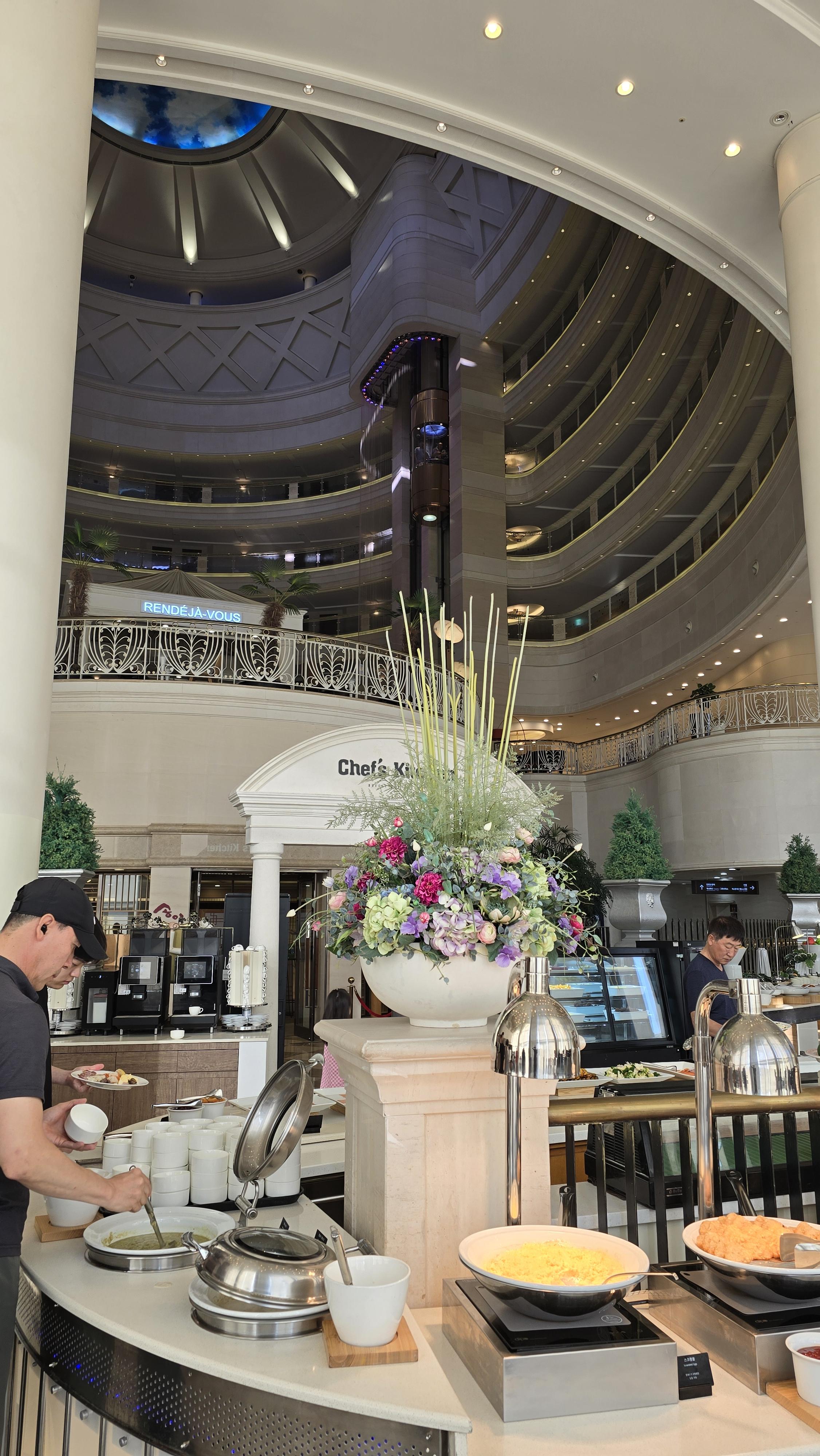 자리를 잡고 입구쪽을 자세히 살펴보니 호텔동 높은 천장이 그대로 보이고 오픈형 엘레베이터와 조명이 어우러려 상당이 아름다운 구조를 보여주고 있습니다. 바깥경치도 내부경치도 매우 좋아서 휴양지에서 아침식사를 하는 분위기가 무척 좋습니다.
