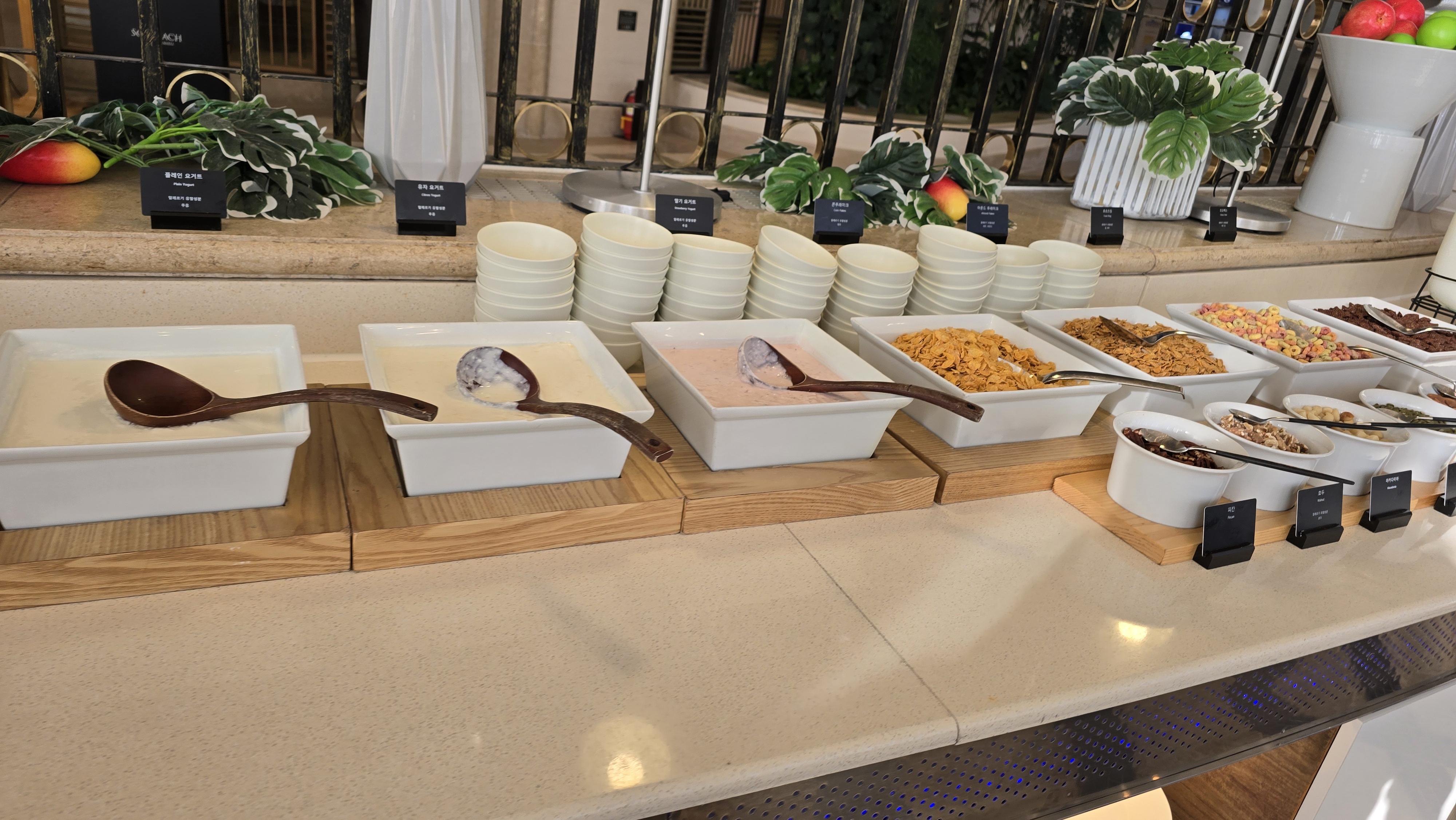 가벼운 아침을 위한 시리얼과 요거트, 견과류 등의 메뉴로 구성된 테이블도 보이고 있습니다. 요거트도 딸기, 플레인, 오트밀 등 참으로 다양한 식성을 고려한 구성이 마음에 듭니다.
