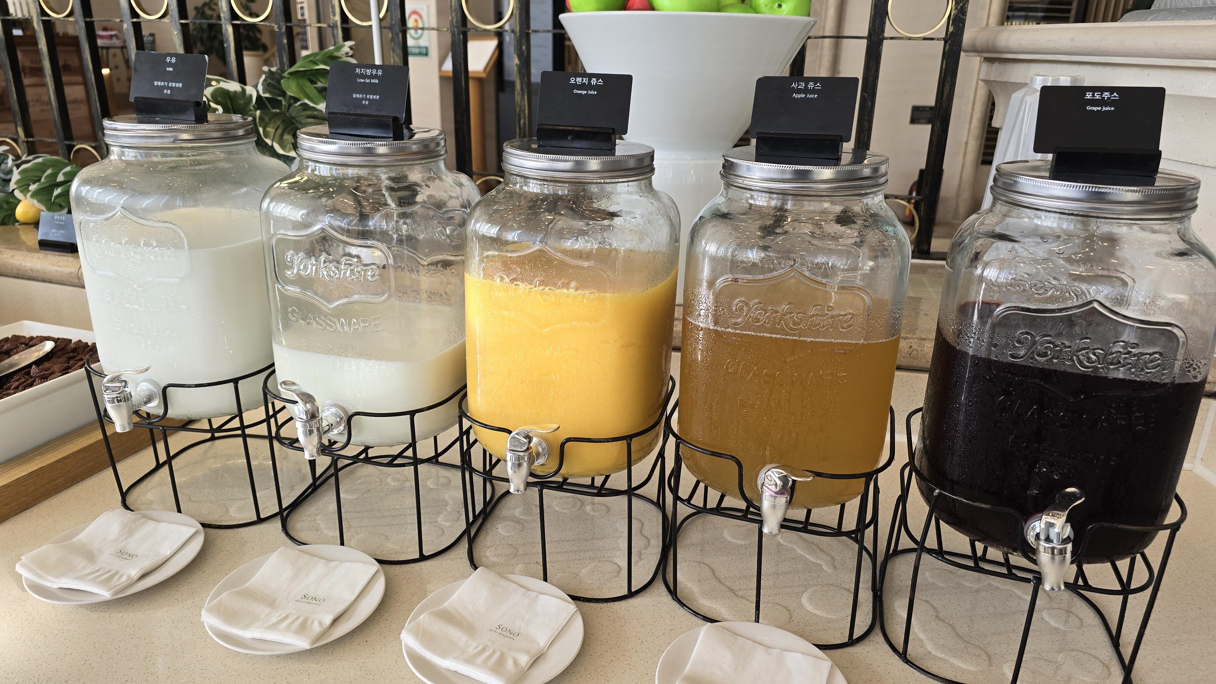음료도 커피와 함께 우유, 저지방우유, 오렌지주스 및 다양한 마실거리를 번갈아가며 테스트해보고 셰프스키친 양양의 퀄리티를 몸소 체험해봅니다.