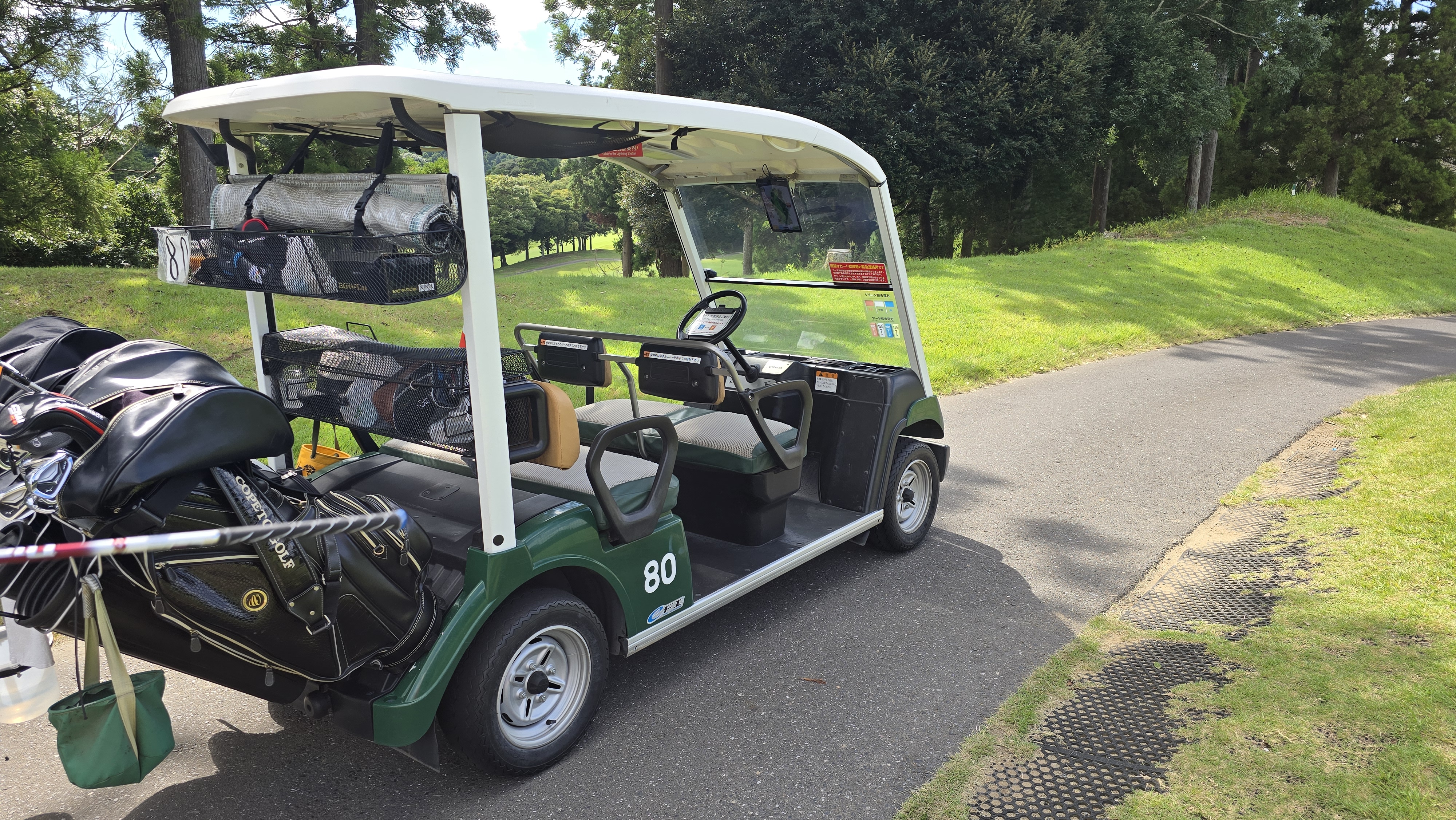 락커에서 옷을 갈아입고 나오니 골프백은 카트에 실어져 있고 출발준비가 끝났습니다. 카트를 자세히 살펴보니 전기로 움직이는게 아닌 가솔린 엔진으로 움직이는 카트임을 알게 됩니다. 치바 사쿠라노사토 골프클럽 카트의 가장 큰 특징은 자동, 혹은 수동으로 카트를 조정할 수 있고 페어웨이에도 들어갈 수 있다는 점입니다. 매우 자유도가 높기 때문에 편리한 골프가 될 수 있는 점이 강점이라 할 수 있습니다.