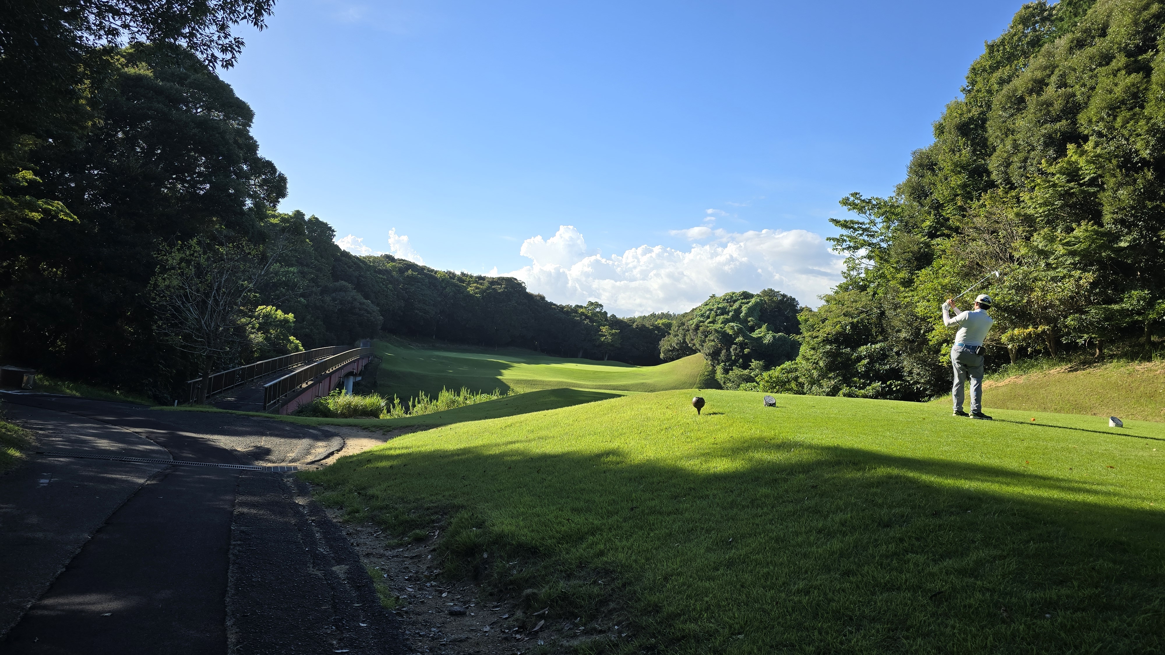 드디어 시작된 라운딩 한눈에 보기에도 초록색 잔디와 나무 그리고 푸른 하늘이 어우러져 한폭의 그림과 같은 절경을 자아내고 있습니다. 페어웨이 잔디는 양잔디로 밟아도 탄성이 느껴질 정도로 매우 푹신한 느낌을 보여주고 있으며 티잉 그라운드도 매트를 찾아볼 수 없이 매끈하게 관리된 모습이 감탄을 자아내게 만듭니다.