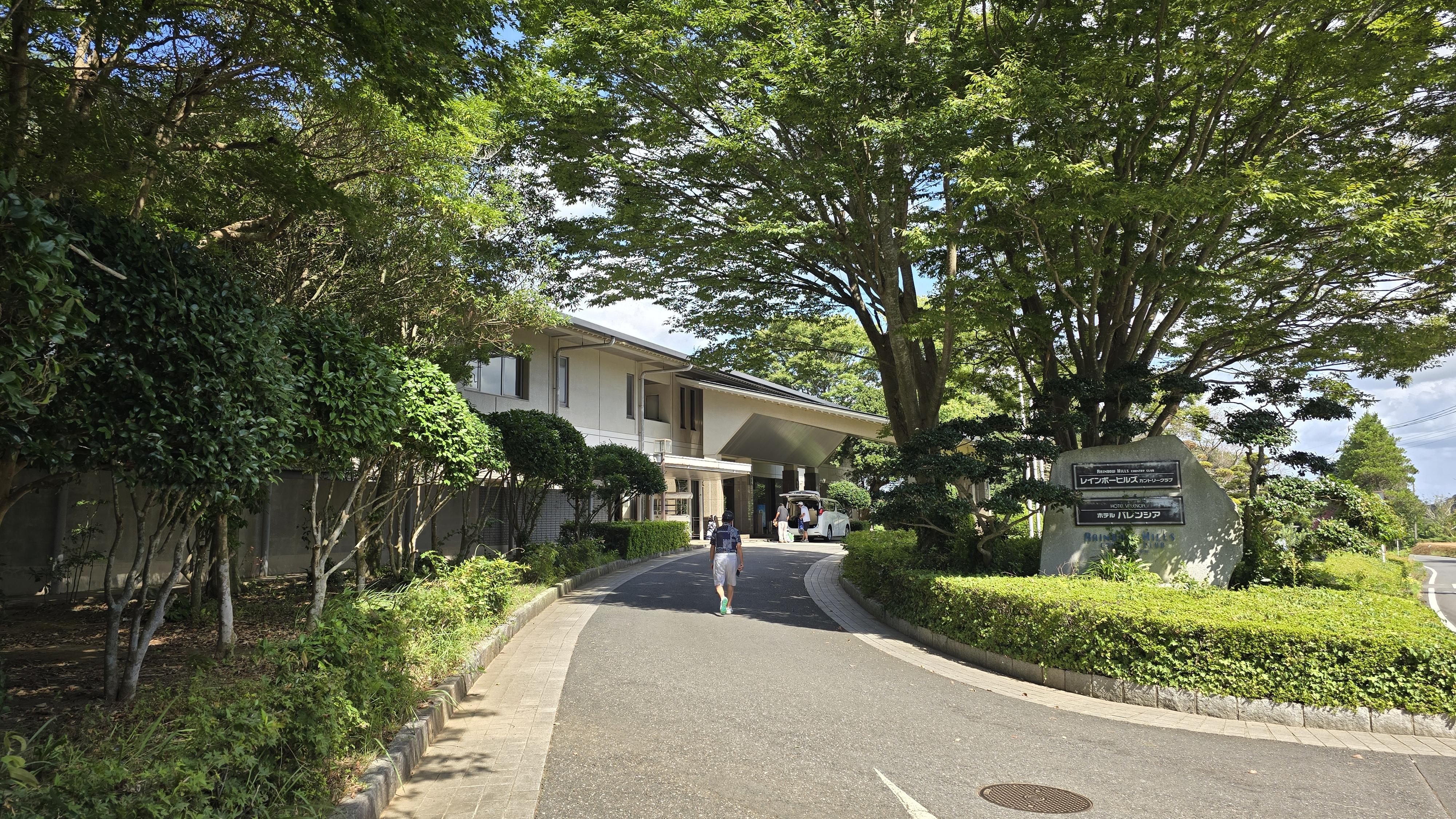 바깥에서 클럽하우스 전경을 살펴보면 깔끔해보이는 대리석 건물에 울창한 나무가 어우러져 있어 자연친화적인 분위기를 보여주고 레인보우힐스CC 영어로는 Rainbow Hills Country Club 일어로는 レインボーヒルズカントリークラブ 이 적혀있는 돌로된 안내판이 보이고 있습니다.