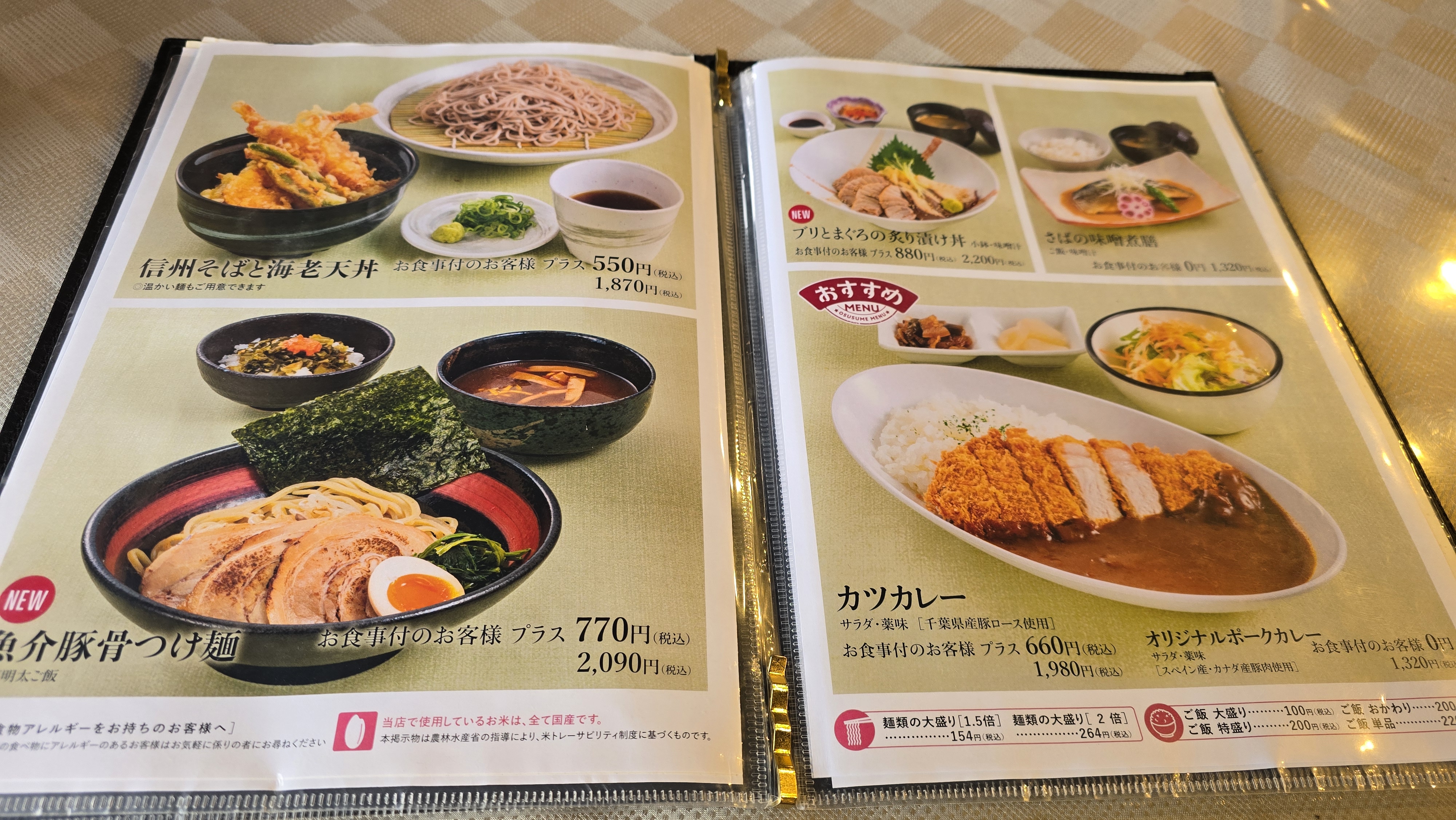 메뉴판을 펴고 오늘의 점심은 무엇을 할까 고민을 해봅니다. 메밀소바, 우동, 돈가스 등 매우 친숙한 메뉴들이 일본어를 읽지 못해도 선택을 할 수 있을 정도로 자세하게 사진이 나와있기 때문에 고민할 필요가 없는 메뉴판입니다.