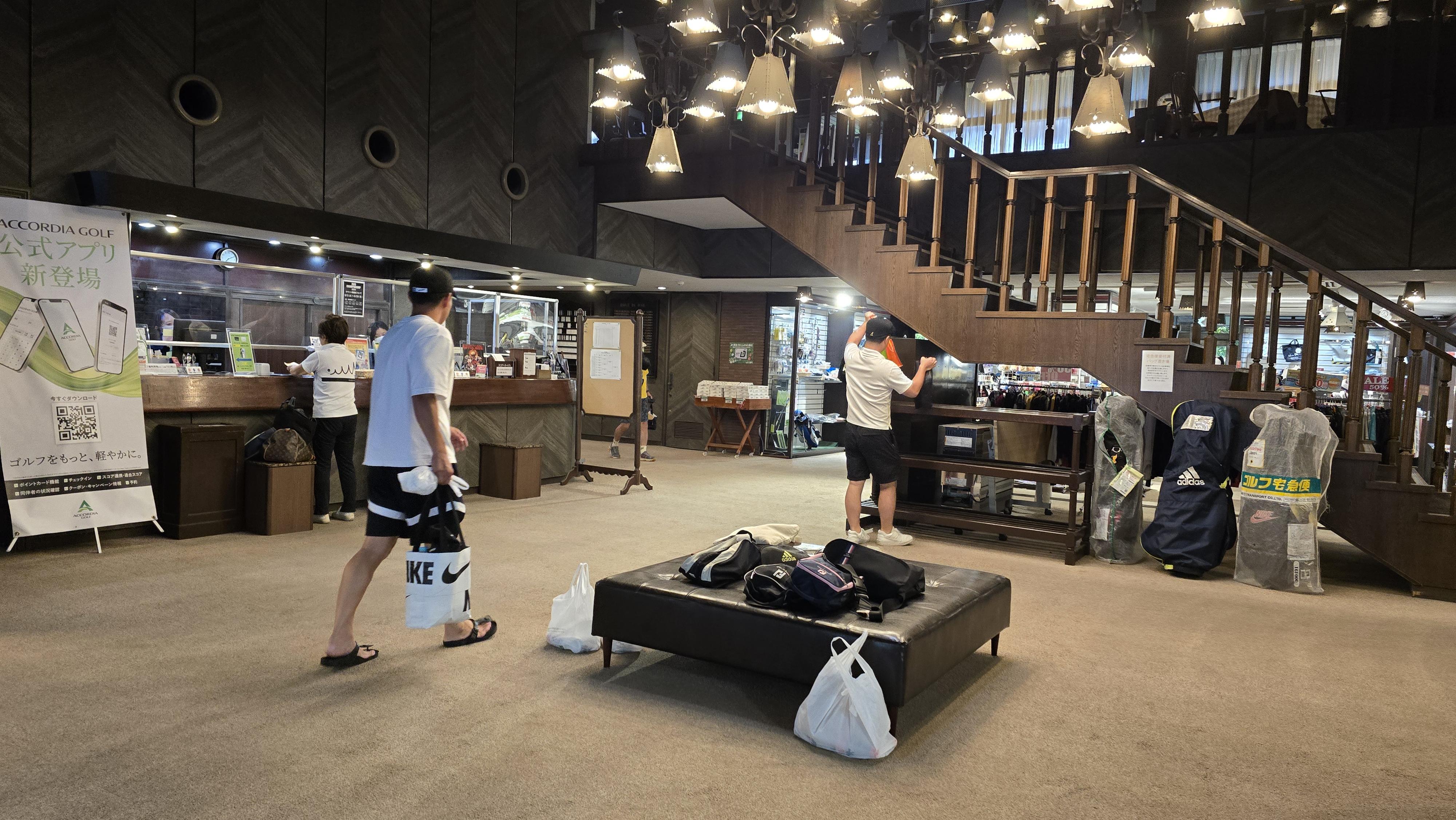 주차를 하고 입구를 자세히 보니 카트가 차례를 기다리며 일렬로 줄을 서있는 모습이 보이고 역시 전기카트가 아닌 가솔린엔진으로 동작하는 모델임이 눈에 들어옵니다. 일본 골프장에서는 전기카트보다 가솔린으로 움직이는 카트가 보편화되어 있는 모습입니다.