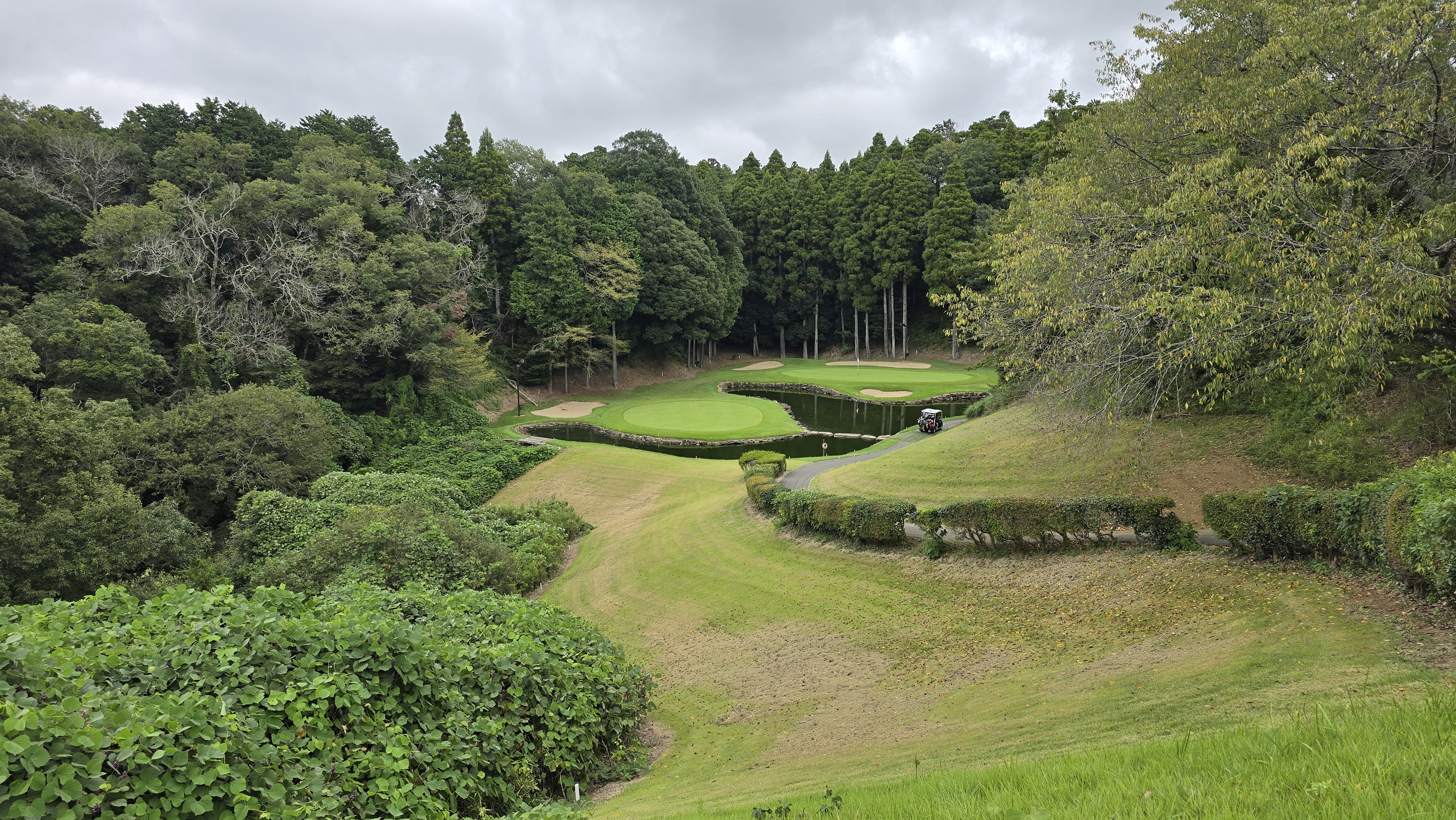 스카이웨이 컨트리클럽 시그니처 코스라고도 할 수 있는 인코스 6번 아일랜드 형의 파3홀입니다. 앞과 뒤 2개의 그린이 모두 아일랜드 형태로 호수 가운데 위치하고 있으며 뒤쪽그린의 경우 거리도 150m 정도로 만만치 않기 때문에 한번에 보내기도 어렵고 핀도 극악으로 앞핀으로 꽂아놔서 낮은 탄도도 공략할 수가 없습니다.