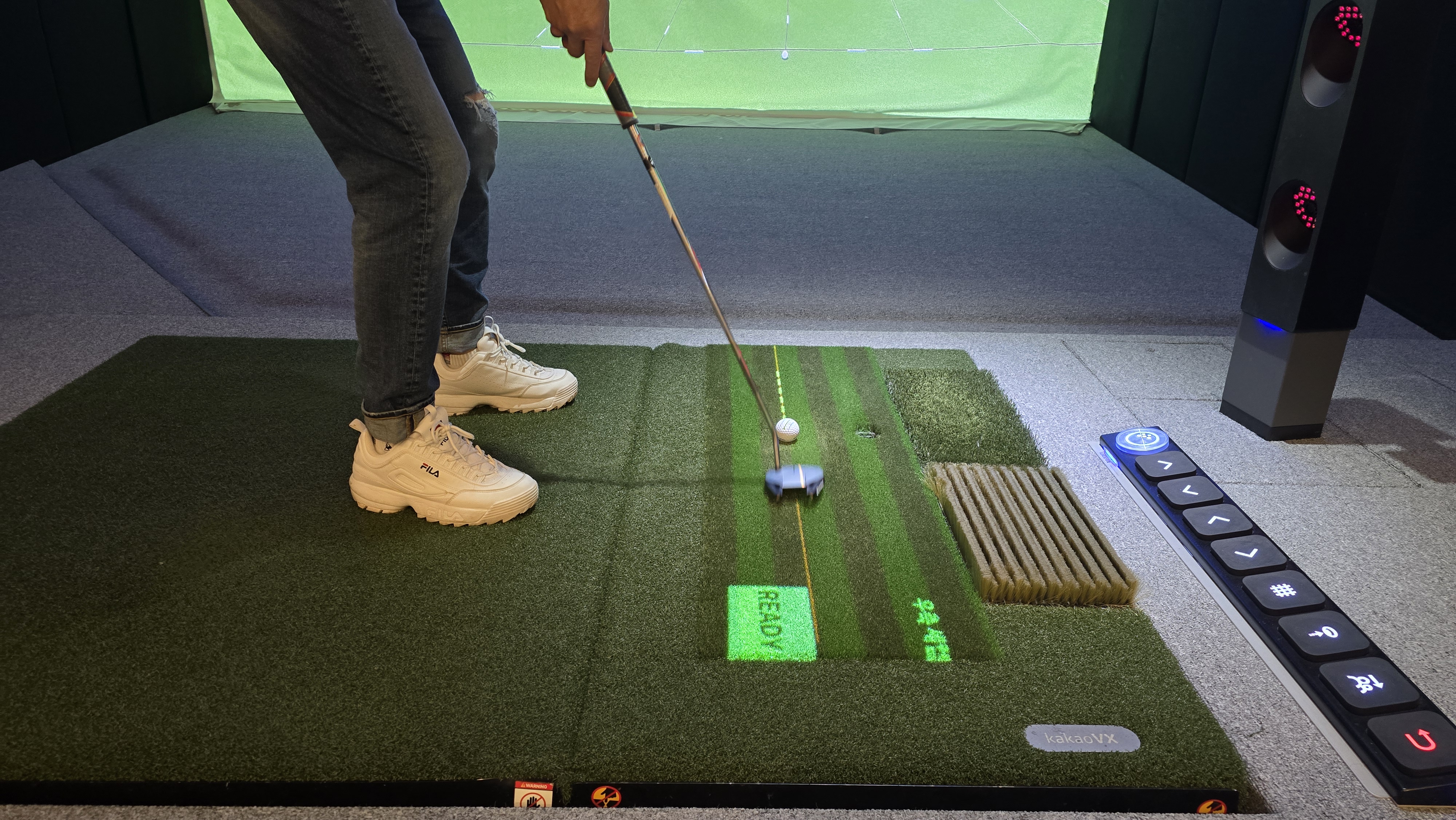 프렌즈스크린 퀀텀에서 퍼팅시스템도 살펴보니 좌우측 몇컵을 가르키는 것을 다른곳과 같으나 매트에 레이져로 퍼팅방향을 쏴주는것이 매우 색다르게 느껴집니다. 이는 매우 편리하면서도 쉽게 가이드를 해주는 것으로 레이저 방향 퍼팅라인을 직관적으로 보여주기 때문에 퍼팅 공식계산을 할 필요도 없으며 방향을 좌우로 돌려 똑바로 라인과 퍼팅라인을 일직선으로 맞춰주기만 하면 100% 들어가게 되는 무척 편리한 구성으로 아마 내기를 할때는 해당옵션을 끄고 수동으로 계산을 하지 않을까 생각하게 됩니다.