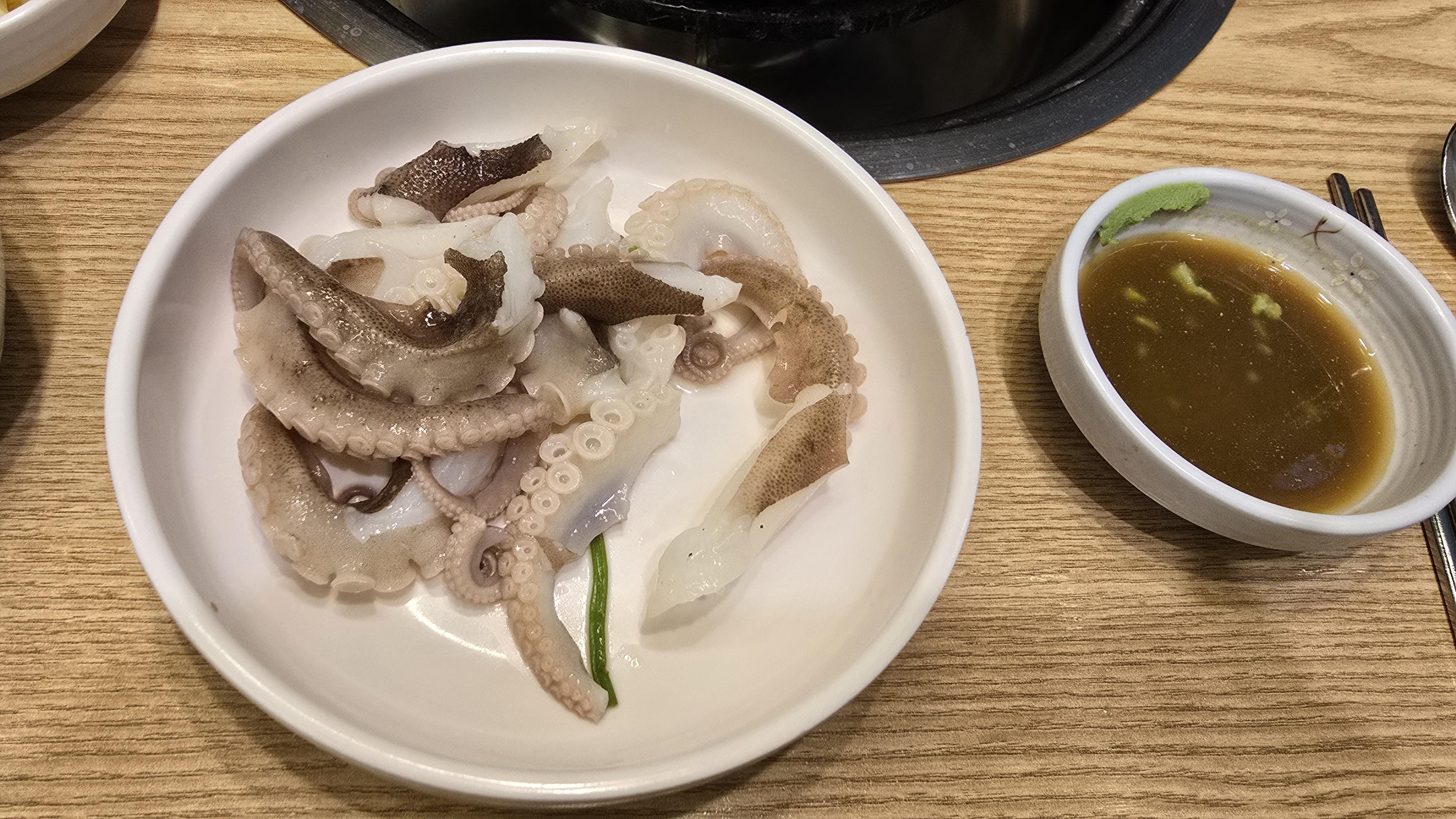 쭈꾸미는 먹기 알맞은 크기로 잘라 싸우지 않게 개인접시에 담아주시고 그위로 따뜻한 육수를 부어 주시는 센스까지 발휘하고 계십니다. 역시 전문점은 다르구나 하는 생각으로 쭈꾸미 맛을보니 야들야들하면서 육수의 깊은맛이 배어들어 씹으면 씹을수록 그 우러나오는 맛을 참기 힘든 매우 행복한 시간이 펼쳐집니다.