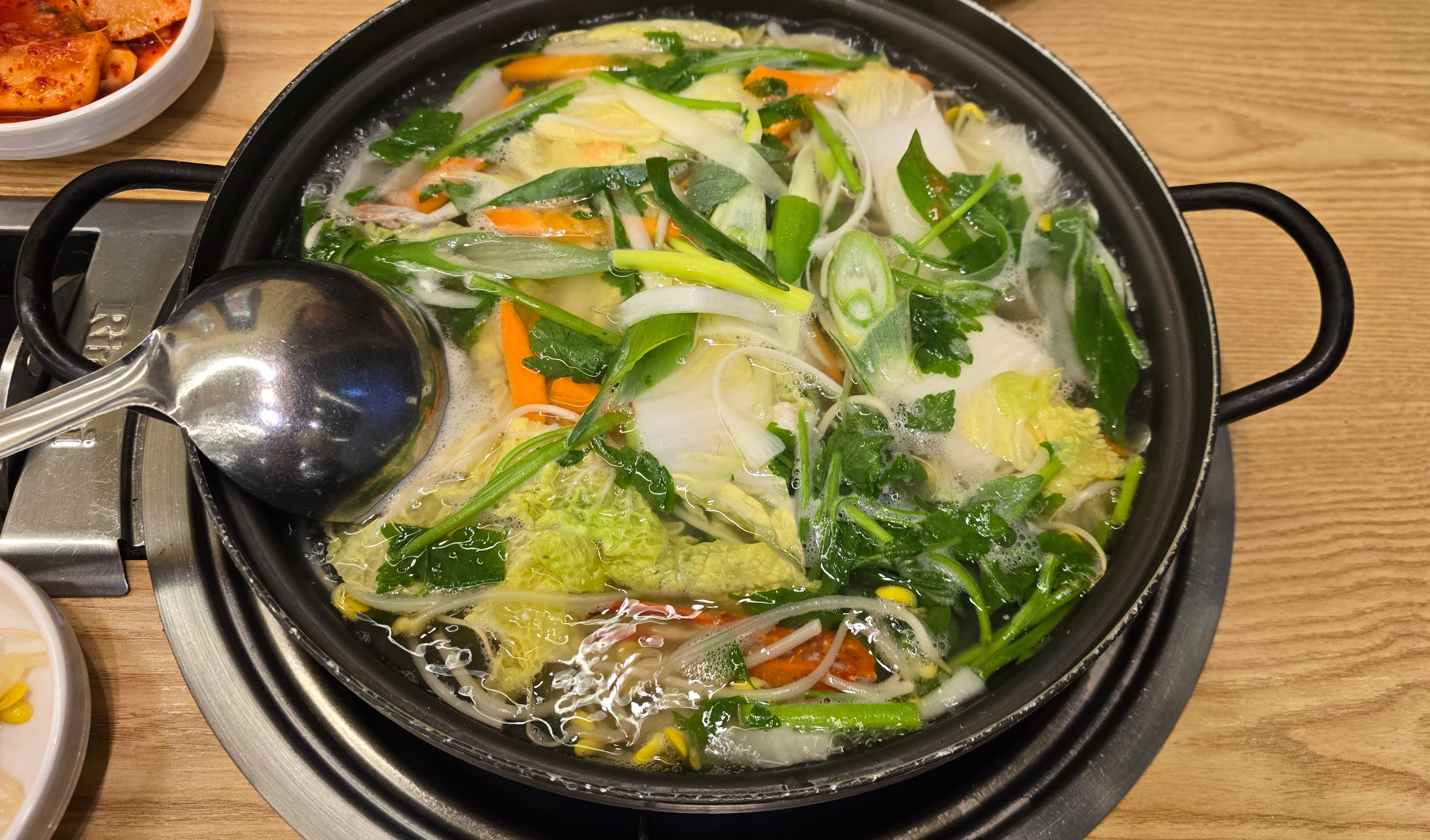 쭈꾸미 샤브샤브를 주문하고 오래되지 않아 육수가 세팅됩니다. 배추와 미나리, 콩나물, 당근 등 갖은 야채가 듬뿍 들어간 육수를 보기만 해도 몸이 건강해지는 기분이 나고 있습니다.