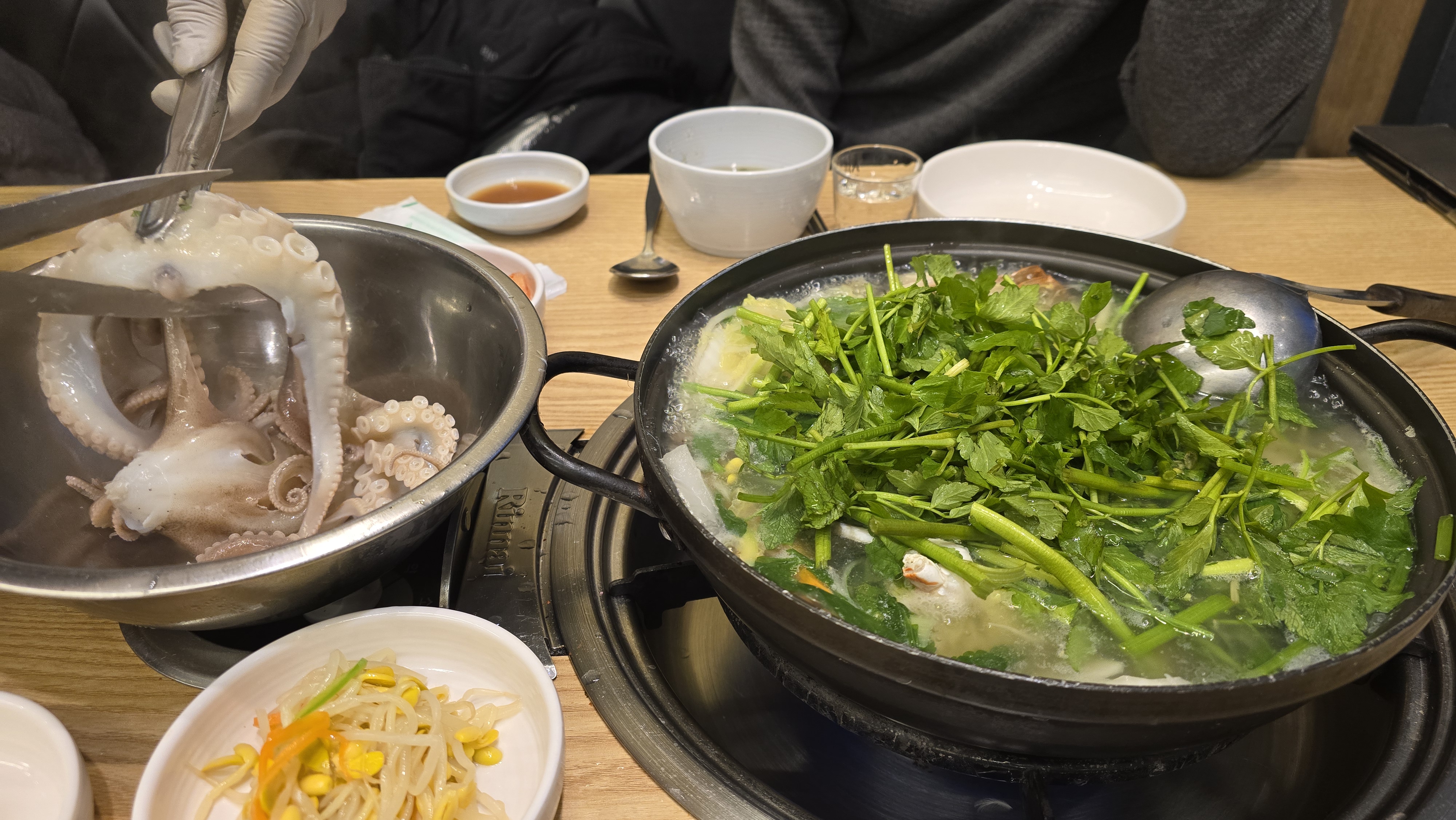 살아있는 쭈꾸미는 육수에 담가 아주 살살 익혀서 따로 건저내는 고난이도 스킬을 직원분께서 해주십니다. 쭈꾸미는 이렇게 해야만 질겨지지 않고 항상 촉촉하고 야들야들하게 먹을수가 있는데 역시나 쭈꾸미 전문점이라 능숙하게 처리해주시는 모습이 감탄을 자아내고 있습니다.
