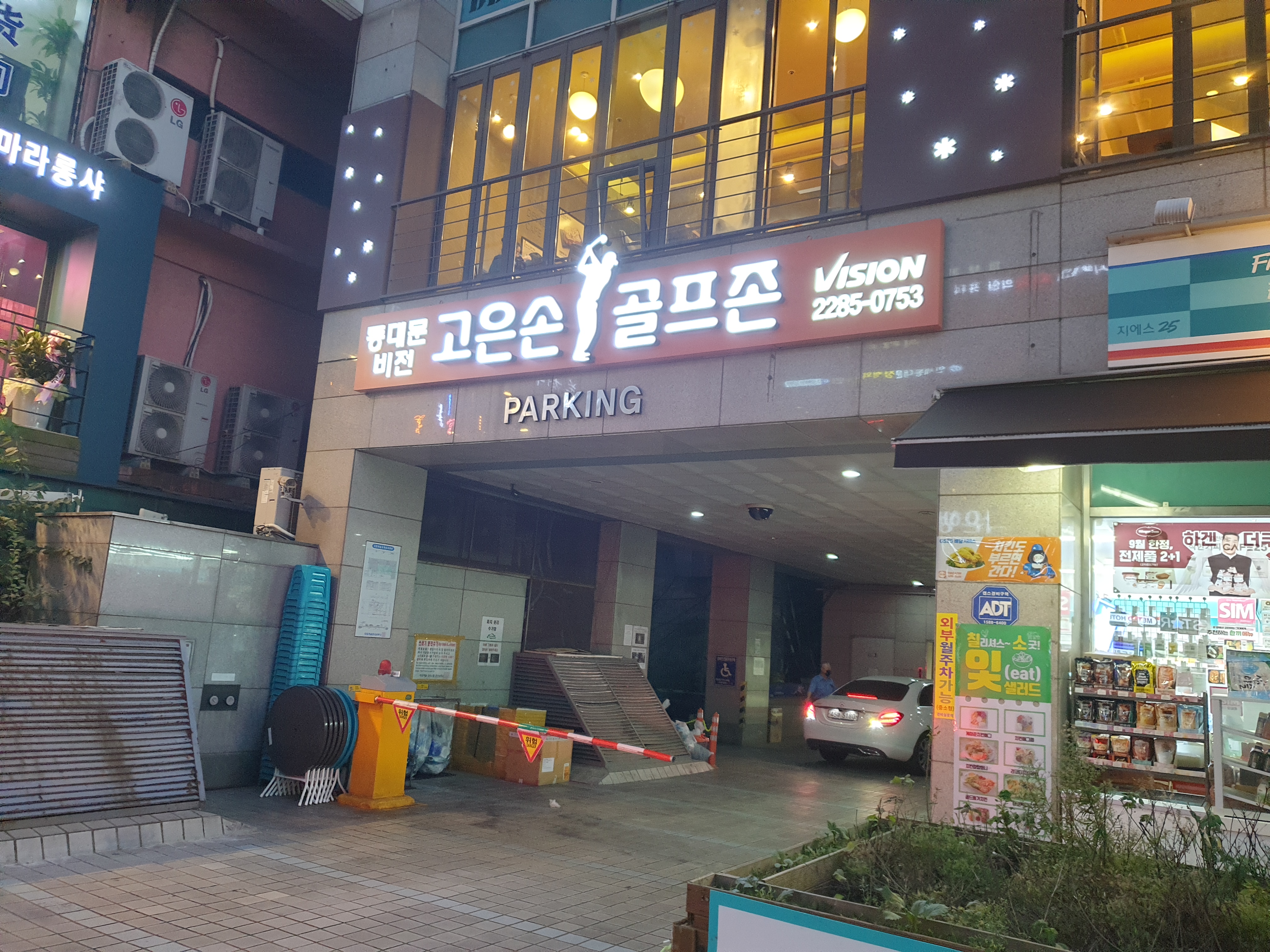 동대문역사문화공원역 12번출구로 나와서 조금 올라가니 건물간판에 동대문 비전 고은손 골프존이라는 간판이 보입니다. 1층에 바로 주차장입구가 보입니다.