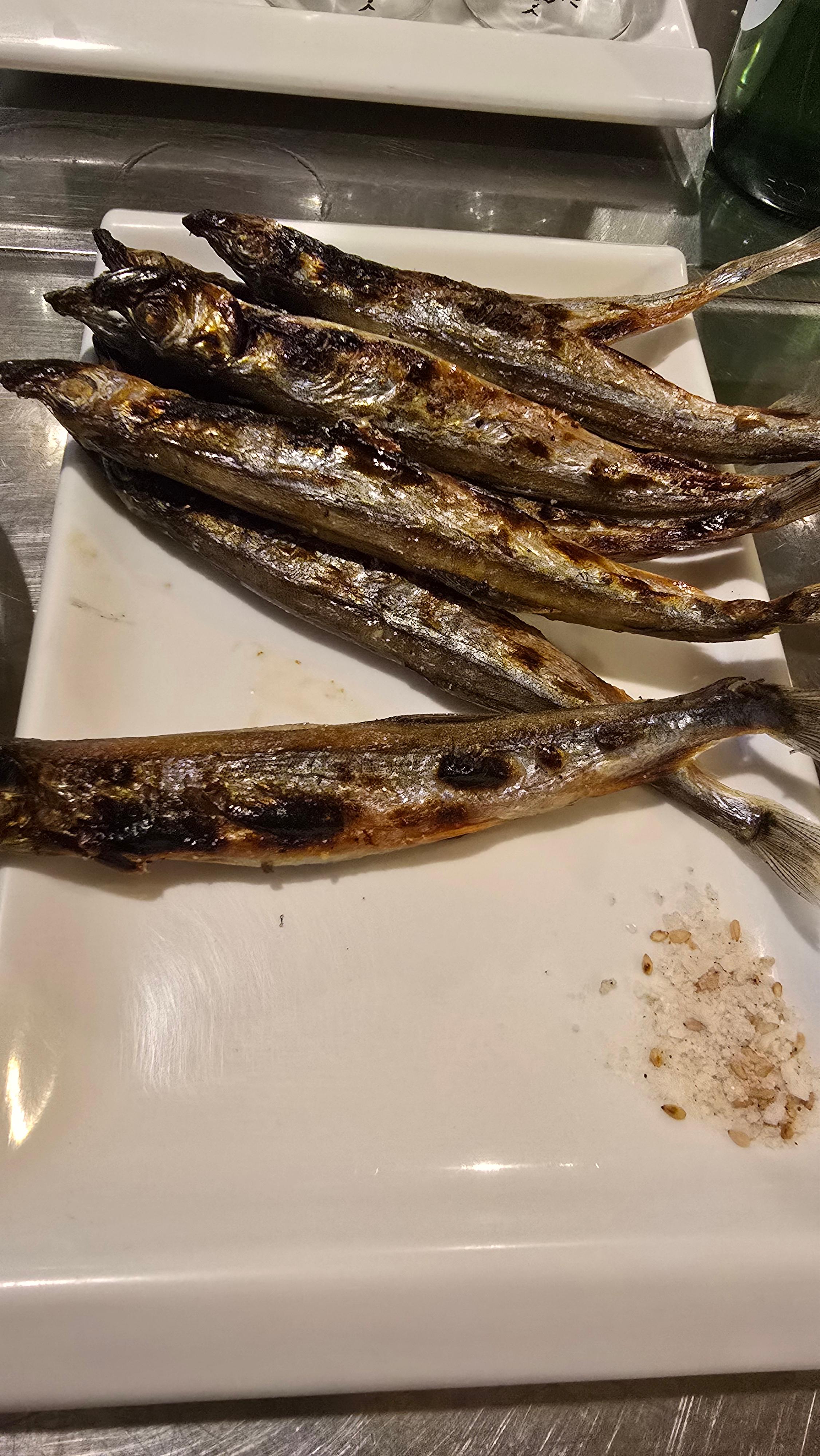 이런저런 생각이 많아질즈음 주문한 시사모도 나와서 맛을보니 오래되지도 않고 잘 구워서 바삭하면서도 알은 톡톡터지며 고소한 전형적인 술안주의 모습을 보여주고 있습니다.