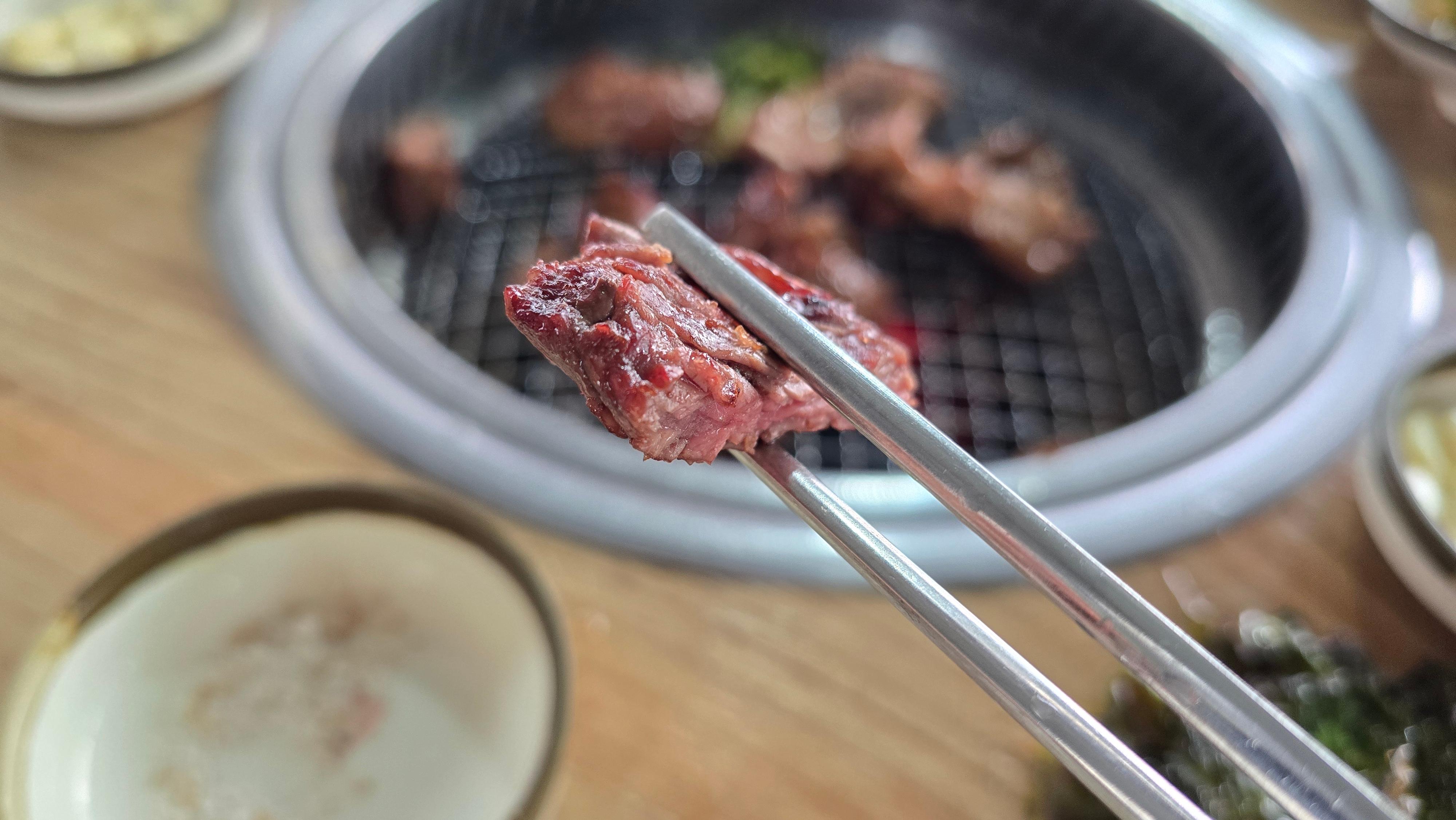 소갈비와 돼지갈비를 각각 불판에 구워 천천히 맛을 음미해봅니다. 소갈비는 수입산인데도 상태가 좋은지 누린내가 나지 않았으며 살짝 익혀도 촉촉하니 맛있는 상태를 보여주고 있습니다. 물론 한우보다 지방끼 어린 특유의 고소한 맛이 덜하기는 하지만 수입산치고는 예상외의 신선도를 보여주고 있습니다.