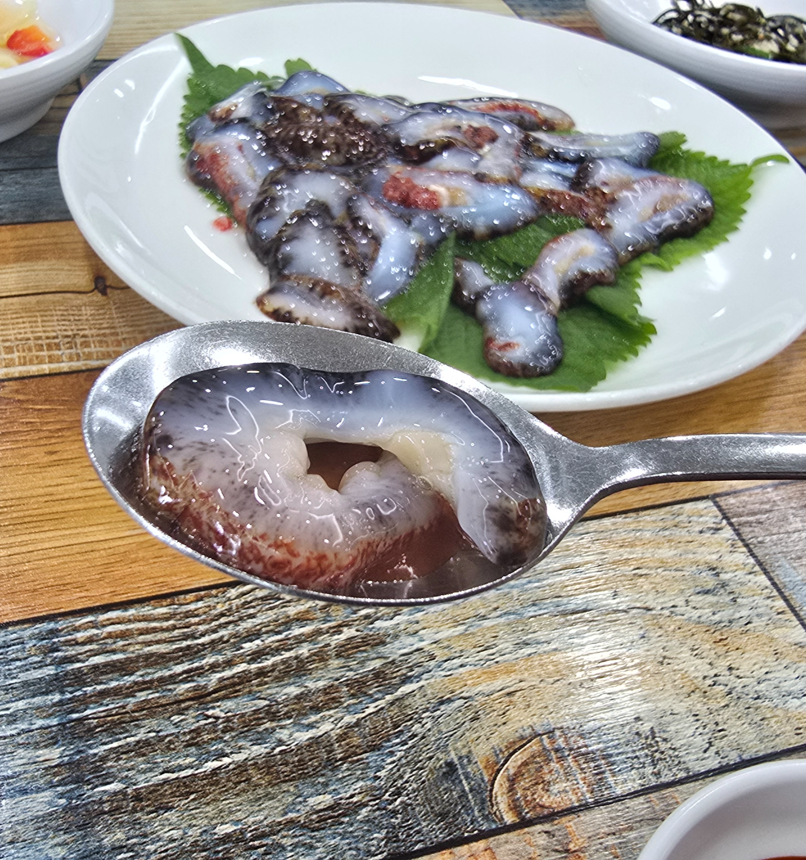 최고의 궁합은 역시 해삼으로 별도로 주문한 해삼을 물회에 추가하여 먹어보면 심심한 간과 해삼의 바다향이 어우러지면 최고의 맛조합을 나타내줍니다.