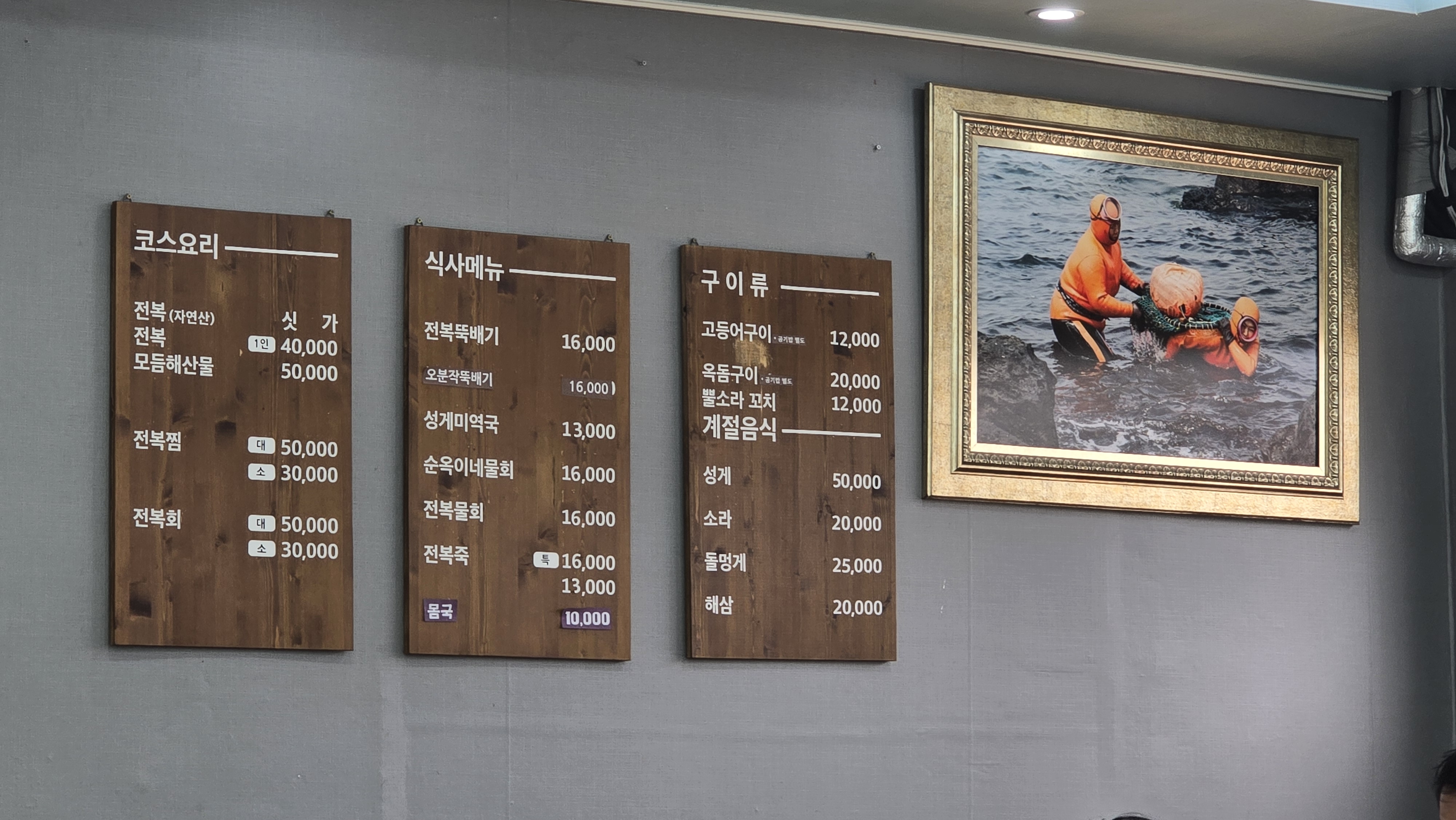 들어가서 자리를 잡고 메뉴판을 살펴보니 QR코드로 주문이 가능하며 어르신들을 위해 메뉴판도 벽에 붙어 있는 것이 보입니다. 전복뚝배기, 성게미역국, 물회, 고등어구이, 옥돔구이 등 제주를 대표하는 메뉴들이 보이고 있으며 물회가 맛있기로 소문나 있는 곳이니 물회와 귀한 해삼을 추가로 주문하여 곁들여보기로 합니다.