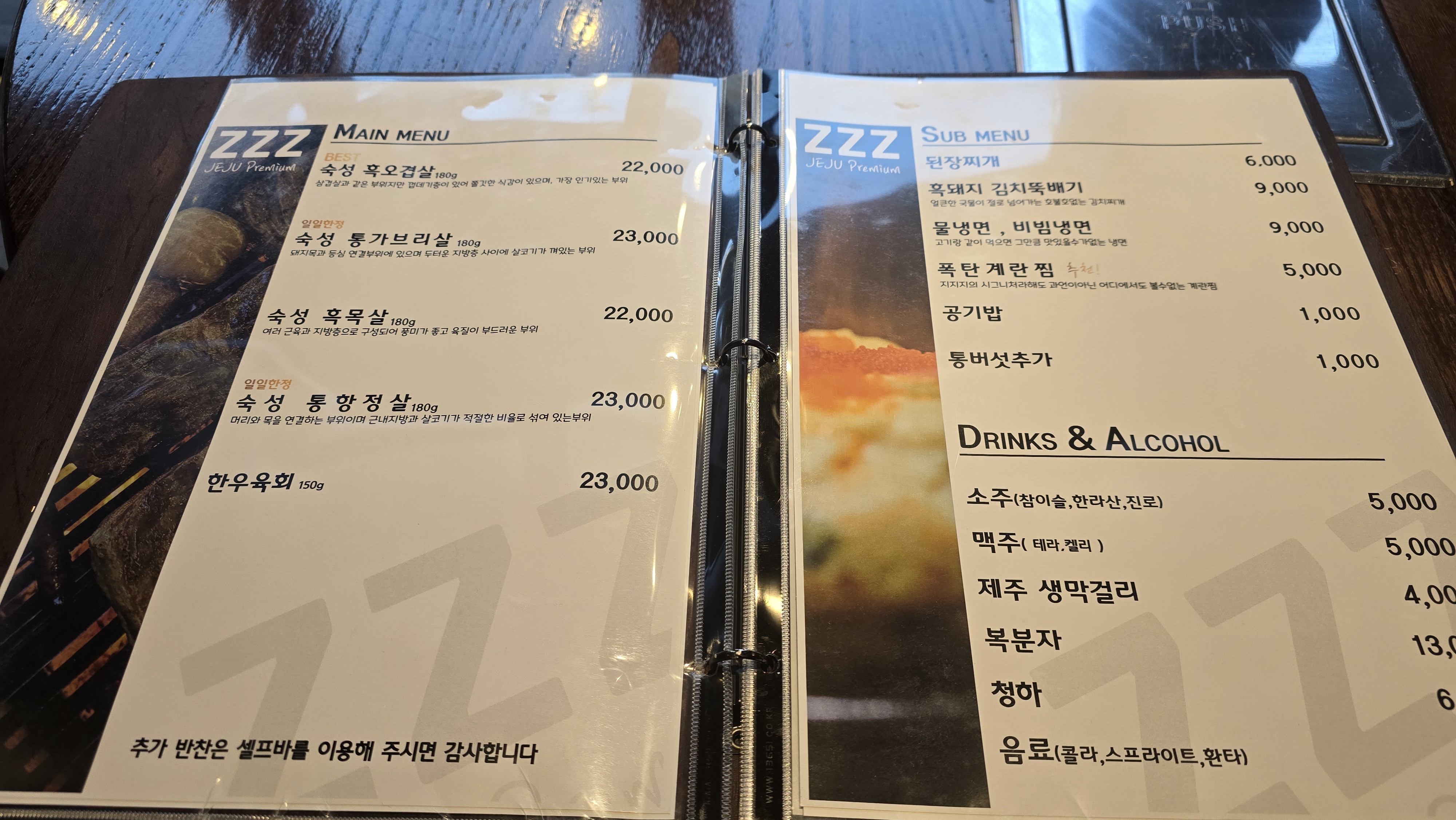들어가서 자리를 잡고 메뉴판을 살펴보니 제주흑돼지는 1인분에 22,000원을 받고 있으며 한우육회도 메뉴판에 있는 것을 볼 수 있습니다.