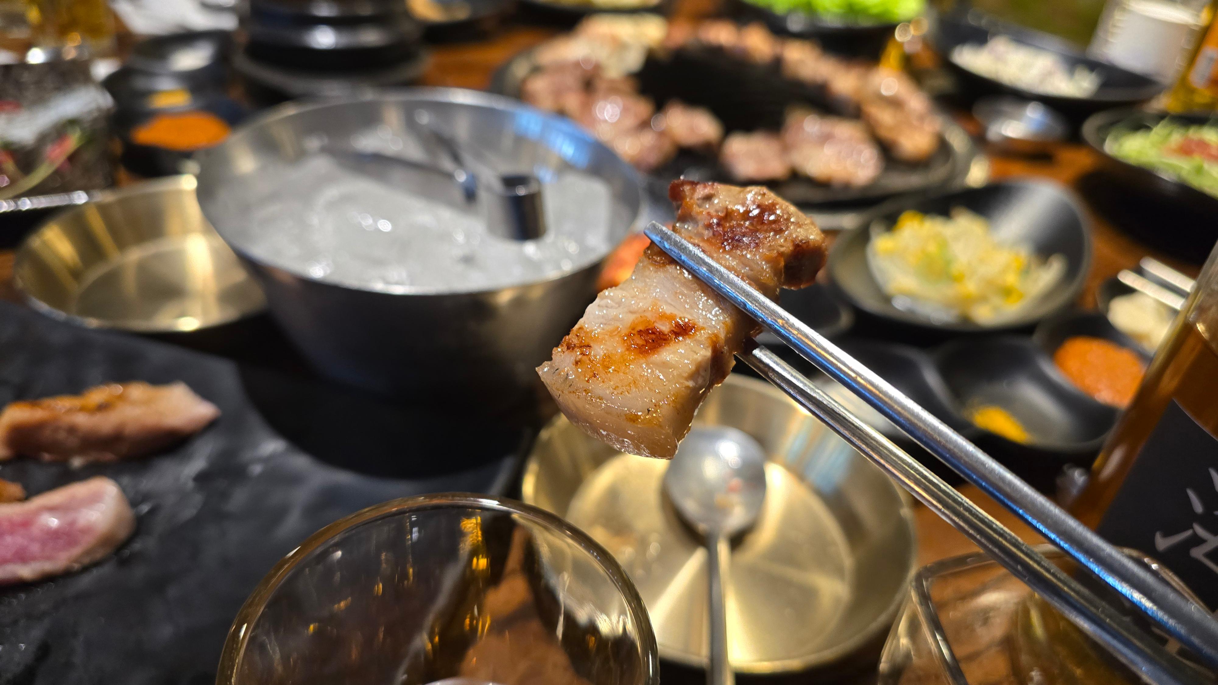 노릇노릇 구워진 고기를 자세히 보면 껍질이 붙어있는 오겹살에 적당한 지방층의 두께로 부드러운 식감을 선사하며 살코기는 제주돼지 특유의 부드러우면서 넘치는 육즙을 선사하므로 어떠한 술과도 잘어울리지만 위스키의 강한 향과 무척 잘어울린다고 느껴지게 되며 즐거운 미식의 시간을 보내게 됩니다.