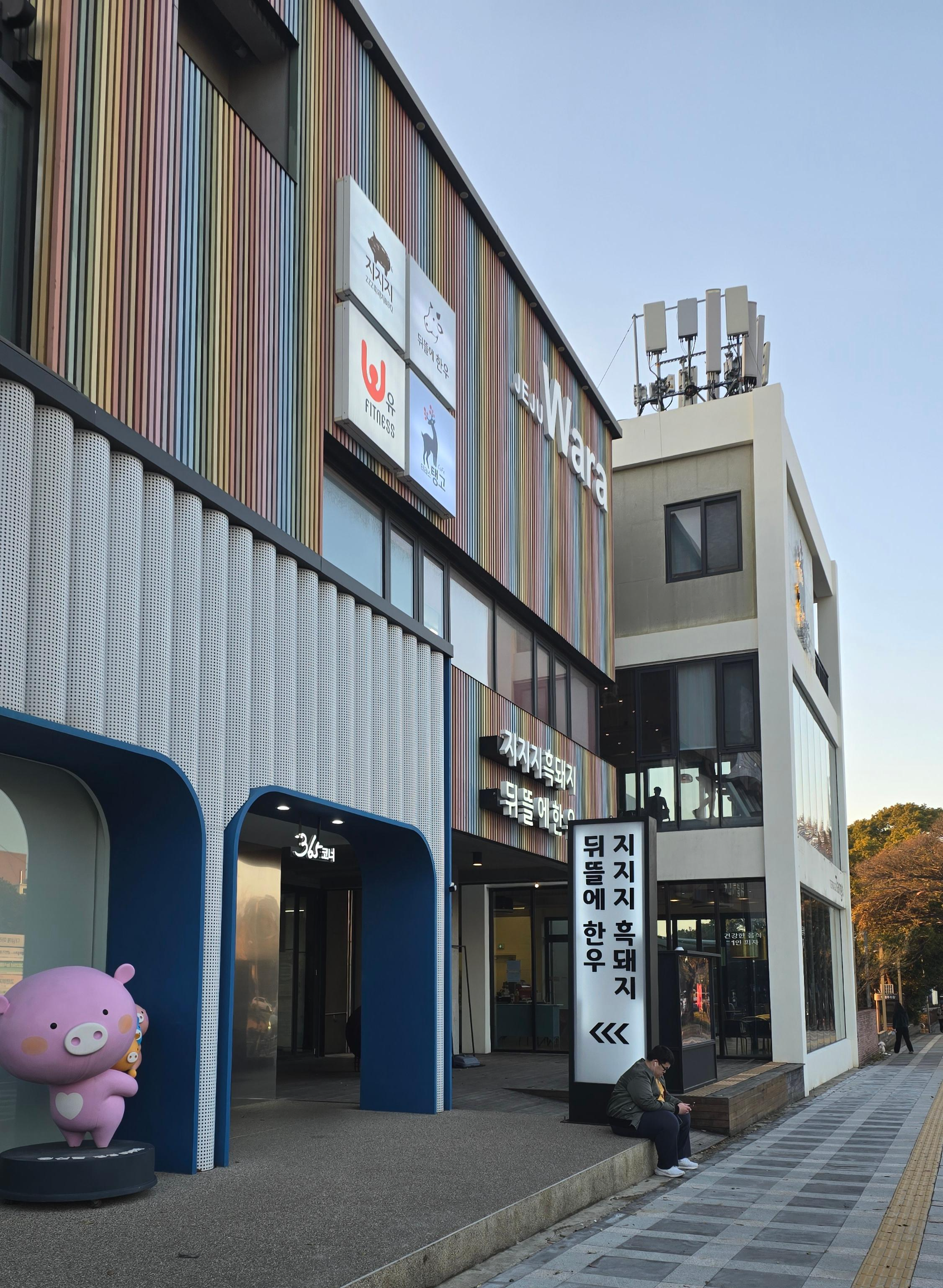 제주에서의 회식자리 분위기가 어디가 좋을까 고민하다 지지지 제주흑돼지가 고기를 구워주고 콜키지도 된다는 말에 장소를 정하고 방문해봅니다. 가게입구에 도착하니 귀여운 돼지모양의 동상이 가게 입구를 가르켜주고 있으며 지지지 흑돼지 뒤뜰에 한우라고 적혀 있는 것으로 보아 흑돼지 뿐만 아니라 한우도 판매하는 곳이라는 것을 알게 됩니다.