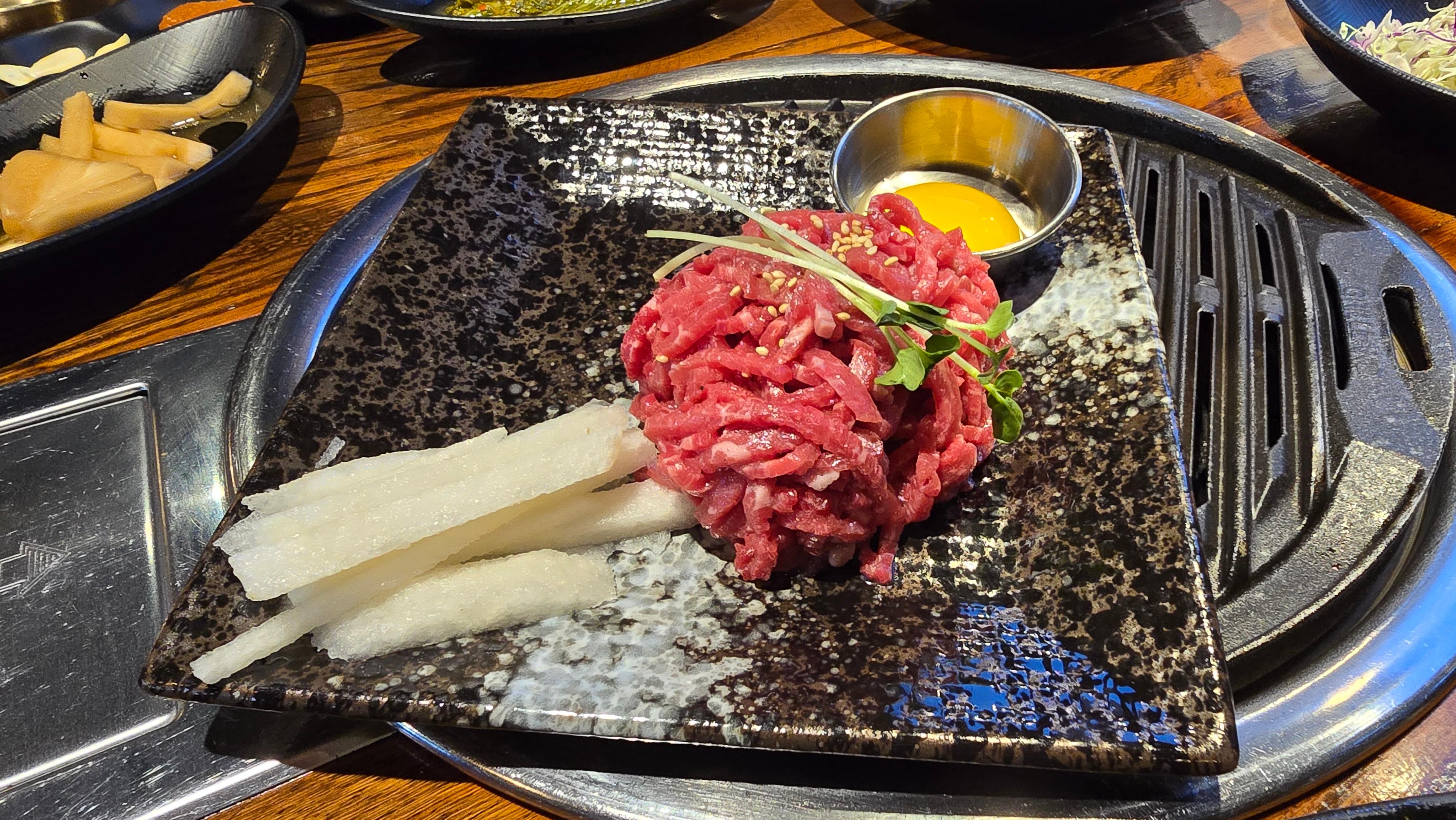 흑돼지가 나오기 전에 먼저 주문한 한우육회를 맛있게 비벼서 맛을보니 고소한 맛을 최대한 살린 양념과 계란 노른자가 섞여 순수한 육회의 맛을 느끼게 해주고 또한 배의 단맛이 조화를 이루며 제법 맛있게 느껴지지만 양념맛의 육회를 좋아하는 사람이라면 호불호가 갈릴 수도 있다는 생각을 해보게 됩니다.